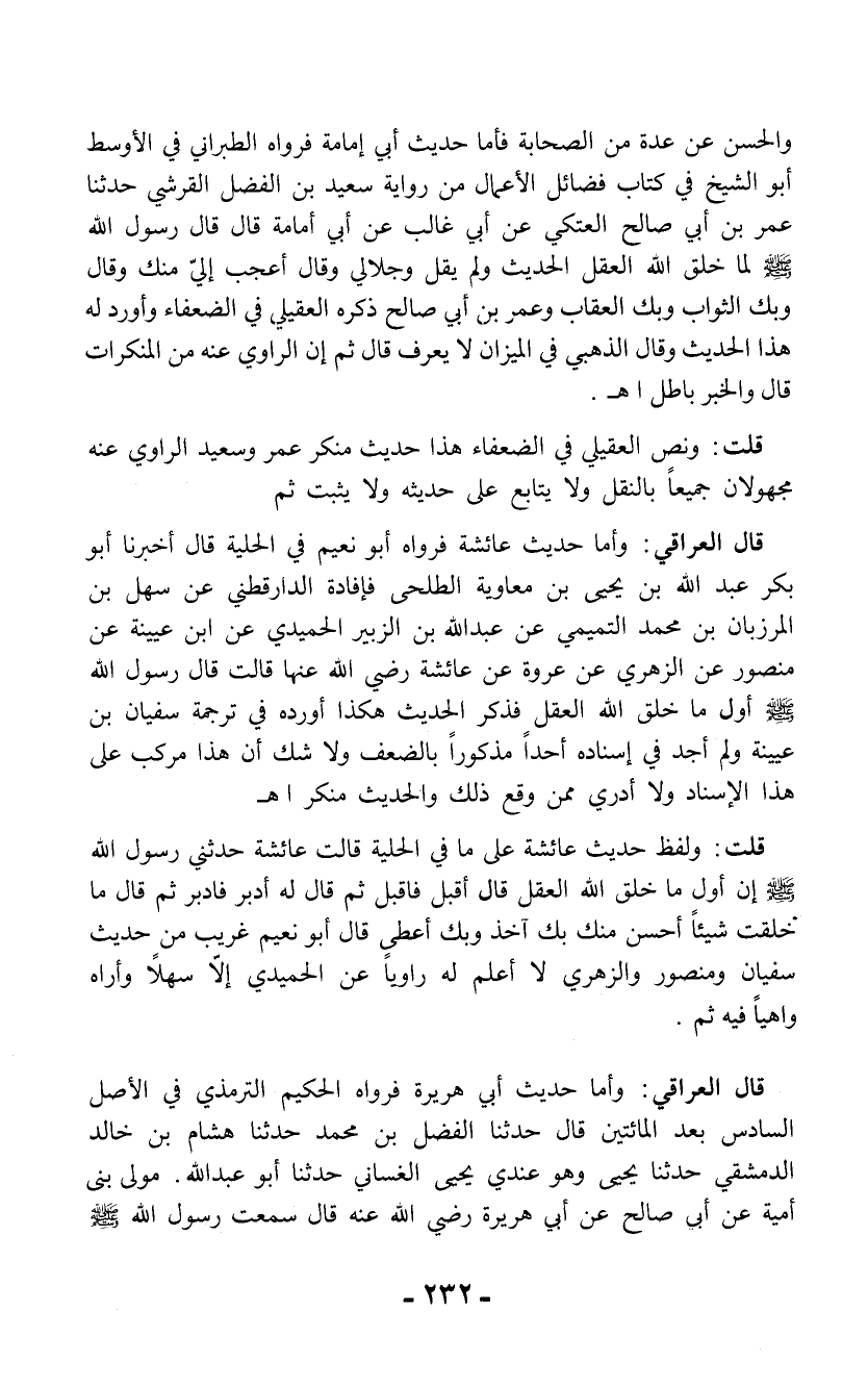 قلت: ولفظ حديث عائشة على ما في الحلية قالت عائشة حدثني رسول الله - صلى الله عليه وسلم - إن أول ما خلق الله العقل قال أقبل فأقبل ثم قال له أدبر فأدبر ثم قال ما خلقت شيئاً أحسن منك بك آخذ وبك أعطى قال أبو نعيم غريب من حديث سفيان ومنصور والزهري لا أعلم له راوياً عن الحميدي إلاَّ سهلاً وأراه واهياً فيه ثم.
