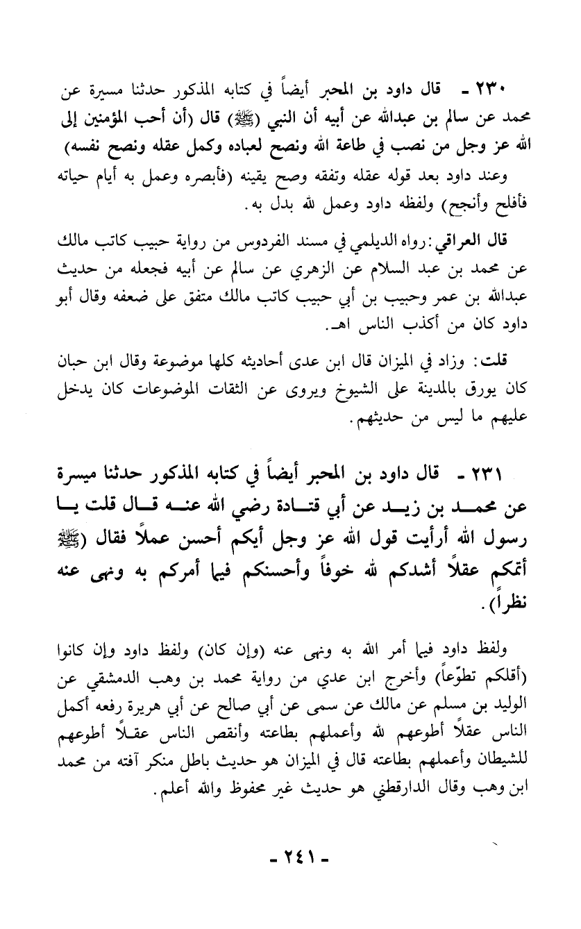 230 - قال داود بن المحبر أيضاً في كتابه المذكور حدثنا مسيرة عن محمد عن سالم بن عبد الله عن أبيه أن النبي - صلى الله عليه وسلم -) قال (أن أحب المؤمنين إلى الله عز وجل من نصب في طاعة الله ونصح لعباده وكمل عقله ونصح نفسه)