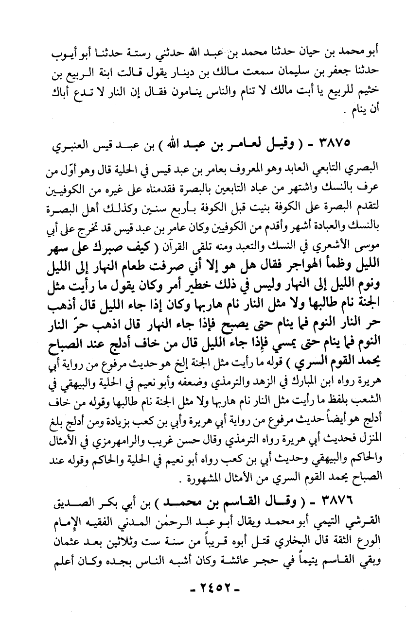 أبو محمد بن حيان حدثنا محمد بن عبد الله حدثني رستة حدثنا أبو أيوب حدثنا جعفر بن سليمان سمعت مالك بن دينار يقول قالت ابنة الربيع بن خثيم للربيع يا أبت مالك لا تنام والناس ينامون فقال إن النار لا تدع أباك أن ينام.