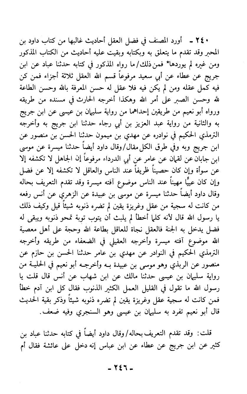 240 - أورد المصنف في فضل العقل أحاديث غالبها من كتاب داود بن المحبر وقد تقدم ما يتعلق به وبكتابه وبقيت عليه أحاديث من الكتاب المذكور ومن غيره لم يوردها* فمن ذلك/ ما رواه المذكور في كتابه حدثنا عباد عن ابن جريج عن عطاء عن أبي سعيد مرفوعاً قسم الله العقل ثلاثة أجزاء فمن كن فيه كمل عقله ومن لم يكن فيه فلا عقل له حسن المعرفة بالله وحسن الطاعة لله وحسن الصبر على أمر الله وهكذا أخرجه الحارث في مسنده من طريقه ورواه أبو نعيم من طريقين إحداهما من رواية سليمان بن عيسى عن ابن جريج به والثانية من رواية عبد العزيز بن أبي رجاء حدثنا ابن جريج به وأخرجه الترمذي الحكيم في نوادره عن مهدي بن ميمون حدثنا الحسن بن منصور عن ابن جريج وبه وفي طرق الكل مقال/ وقال داود أيضاً حدثنا ميسرة عن موسى ابن جابان عن لقمان عن عامر عن أبي الدرداء مرفوعاً إن الجاهل لا تكشفه إلا عن سوأة وإن كان حصيناً ظريفاً عند الناس والعاقل لا تكشفه إلا عن فضل وإن كان عييًّا مهيناً عند الناس موضوع آفته ميسرة وقد تقدم التعريف بحاله وقال داود أيضاً حدثنا ميسرة عن موسى بن عبيدة عن الزهري عن أنس رفعه من كانت له سجية من عقل وغريزة يقين لم تضره ذنوبه شيئاً قيل وكيف ذلك يا رسول الله قال لأنه كلما أخطأ لم يلبث أن يتوب توبة تمحو ذنوبه ويبقى له فضل يدخل به الجنة فالعقل نجاة للعاقل بطاعة الله وحجة على أهل معصية الله موضوع آفته ميسرة وأخرجه العقيلي في الضعفاء من طريقه وأخرجه الترمذي الحكيم في النوادر عن مهدي بن عامر حدثنا الحسن بن حازم عن منصور عن الربذي وهو موسى بن عبيدة به وأخرجه أبو نعيم في الحلية من رواية سليمان بن عيسى حدثنا مالك عن ابن شهاب عن أنس قال قلت يا رسول الله ما تقول في القليل العمل الكثير الذنوب فقال كل ابن آدم خطأ فمن كانت له سجية عقل وغريزة يقين لم تضره ذنوبه شيئاً وذكر بقية الحديث قال أبو نعيم تفرد به سليمان بن عيسى وهو السنجري وفيه ضعف.