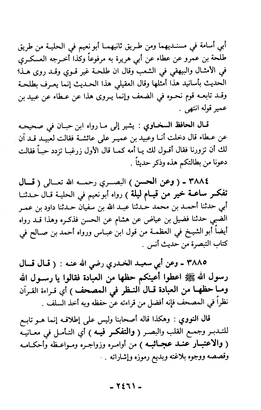 3884 - (وعن الحسن) البصري رحمه الله تعالى (قال تفكر ساعة خير من قيام ليلة) رواه أبو نعيم في الحلية قال حدثنا أبي حدثنا أحمد بن محمد حدثنا عبد الله بن سفيان حدثنا داود بن عمر الضبي حدثنا فضيل بن عياض عن هشام عن الحسن فذكره وهذا قد رواه أيضاً أبو الشيخ في العظمة من قول ابن عباس ورواه أحمد بن صالح في كتاب التبصرة من حديث أنس.