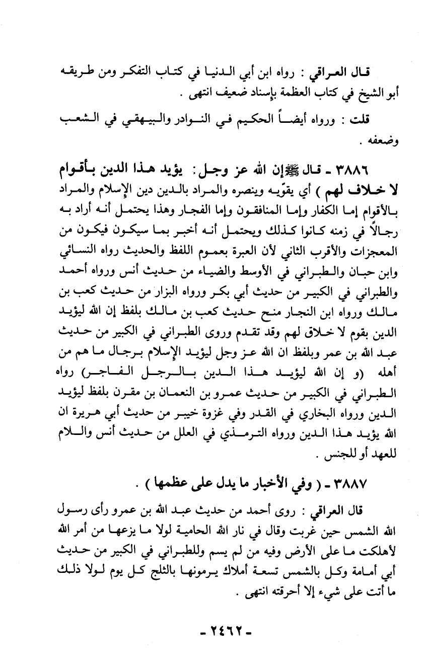 3886 - قال - صلّى الله عليه وسلم - إن الله عز وجل: يؤيد هذا الدين بأقوام لا خلاف لهم) أي يقوّيه وينصره والمراد بالدين دين الإسلام والمراد بالأقوام إما الكفار وإما المنافقون وإما الفجار وهذا يحتمل أنه أراد به رجالاً في زمنه كانوا كذلك ويحتمل أنه أخبر بما سيكون فيكون من المعجزات والأقرب الثاني لأن العبرة بعموم اللفظ والحديث رواه النسائي وابن حبان والطبراني في الأوسط والضياء من حديث أنس ورواه أحمد والطبراني في الكبير من حديث أبي بكر ورواه البزار من حديث كعب بن مالك ورواه ابن النجار منح حديث كعب بن مالك بلفظ إن الله ليؤيد الدين بقوم لا خلاق لهم وقد تقدم وروى الطبراني في الكبير من حديث عبد الله بن عمر وبلفظ أن الله عز وجل ليؤيد الإسلام برجال ما هم من أهله (وإن الله ليؤيد هذا الدين بالرجل الفاجر) رواه الطبراني في الكبير من حديث عمرو بن النعمان بن مقرن بلفظ ليؤيد الدين ورواه البخاري في القدر وفي غزوة خيبر من حديث أبي هريرة أن الله يؤيد هذا الدين ورواه الترمذي في العلل من حديث أنس واللام للعهد أو للجنس.