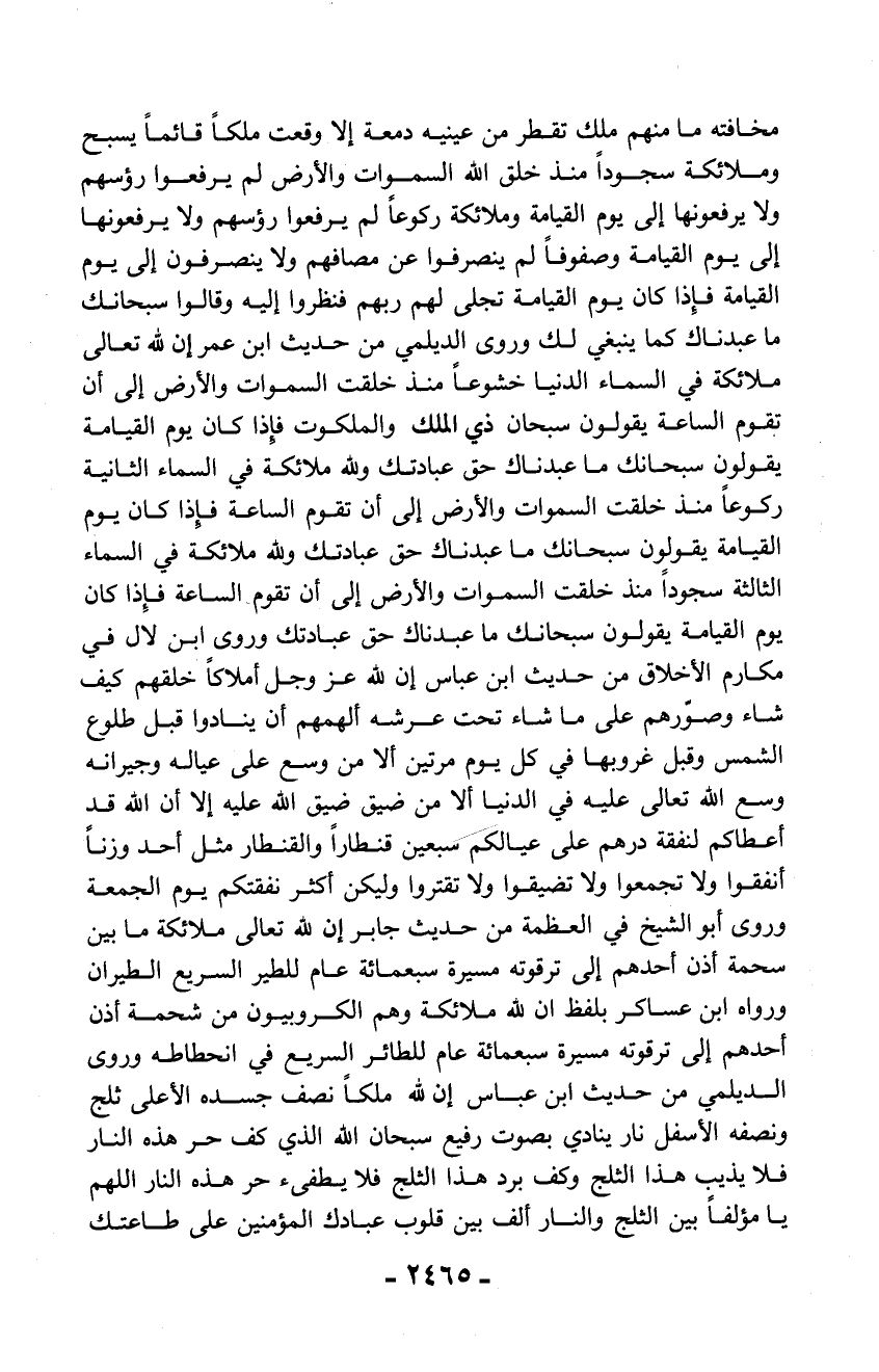 مخافته ما منهم ملك تقطر من عينيه دمعة إلا وقعت ملكاً قائماً يسبح وملائكة سجوداً منذ خلق الله السماوات والأرض لم يرفعوا رؤسهم ولا يرفعونها إلى يوم القيامة وملائكة ركوعاً لم يرفعوا رؤسهم ولا يرفعونها إلى يوم القيامة وصفوفاً لم ينصرفوا عن مصافهم ولا ينصرفون إلى يوم القيامة فإذا كان يوم القيامة تجلى لهم ربهم فنظروا إليه وقالوا سبحانك ما عبدناك كما ينبغي لك وروى الديلمي من حديث ابن عمر إن لله تعالى ملائكة في السماء الدنيا خشوعاً منذ خلقت السماوات والأرض إلى أن تقوم الساعة يقولون سبحان ذي الملك والملكوت فإذا كان يوم القيامة يقولون سبحانك ما عبدناك حق عبادتك ولله ملائكة في السماء الثانية ركوعاً منذ خلقت السماوات والأرض إلى أن تقوم الساعة فإذا كان يوم القيامة يقولون سبحانك ما عبدناك حق عبادتك ولله ملائكة في السماء الثالثة سجوداً منذ خلقت السماوات والأرض إلى أن تقوم الساعة فإذا كان يوم القيامة يقولون سبحانك ما عبدناك حق عبادتك وروى ابن لال في مكارم الأخلاق من حديث ابن عباس إن لله عز وجل أملاكاً خلقهم كيف شاء وصوّرهم على ما شاء تحت عرشه ألهمهم أن ينادوا قبل طلوع الشمس وقبل غروبها في كل يوم مرتين ألا من وسع على عياله وجيرانه وسع الله تعالى عليه في الدنيا ألا من ضيق ضيق الله عليه إلا أن الله قد أعطاكم لنفقة درهم على عيالكم سبعين قنطاراً والقنطار مثل أحد وزناً أنفقوا ولا تجمعوا ولا تضيقوا ولا تقتروا وليكن أكثر نفقتكم يوم الجمعة وروى أبو الشيخ في العظمة من حديث جابر إن لله تعالى ملائكة ما بين سحمة أذن أحدهم إلى ترقوته مسيرة سبعمائة عام للطير السريع الطيران ورواه ابن عساكر بلفظ أن لله ملائكة وهم الكروبيون من شحمة أذن أحدهم إلى ترقوته مسيرة سبعمائة عام للطائر السريع في انحطاطه وروى الديلمي من حديث ابن عباس إن لله ملكاً نصف جسده الأعلى ثلج ونصفه الأسفل نار ينادي بصوت رفيع سبحان الله الذي كف حر هذه النار فلا يذيب هذا الثلج وكف برد هذا الثلج فلا يطفئ حر هذه النار اللهم يا مؤلفاً بين الثلج والنار ألف بين قلوب عبادك المؤمنين على طاعتك