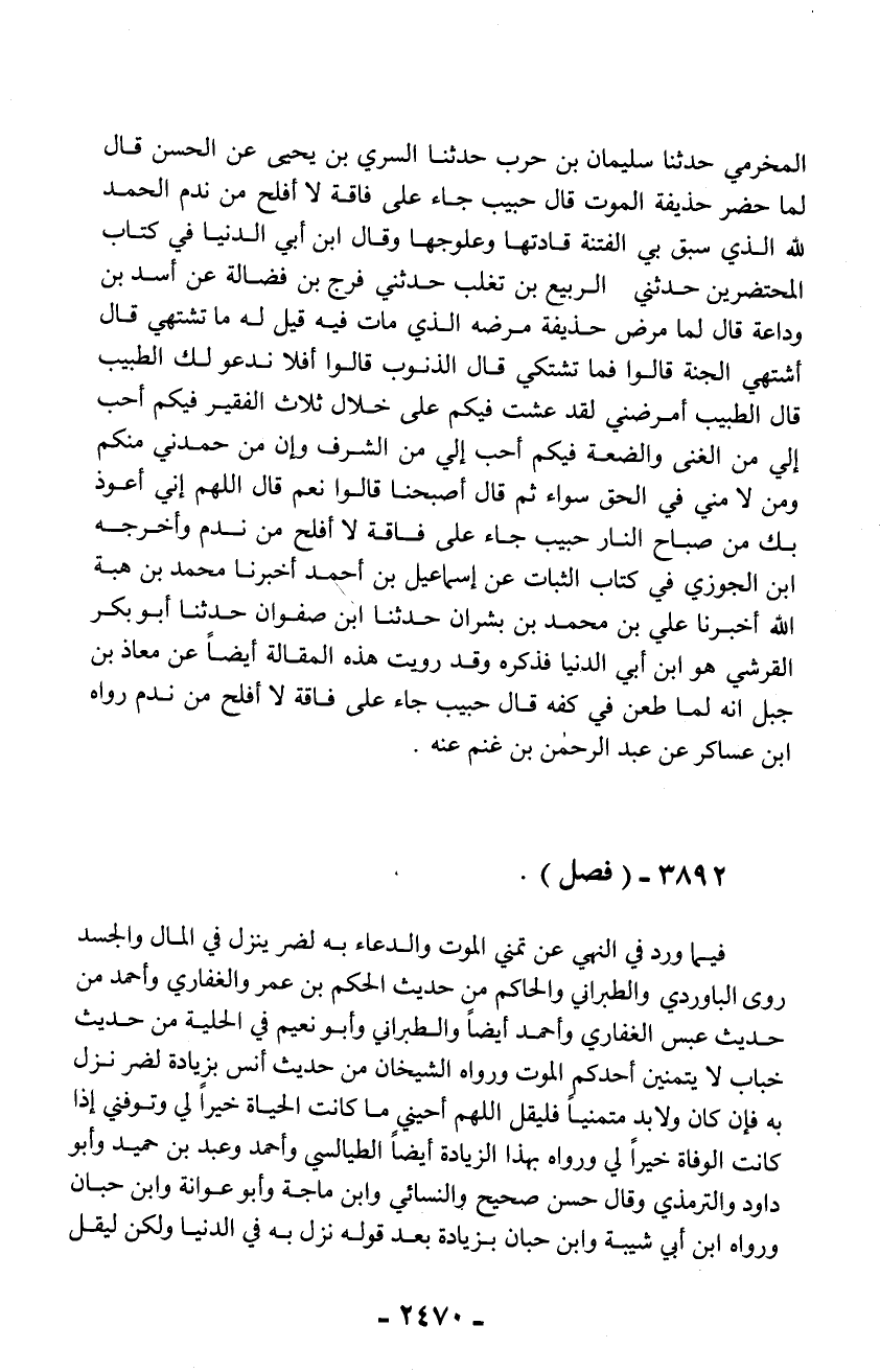 المخرمي حدثنا سليمان بن حرب حدثنا السري بن يحيى عن الحسن قال لما حضر حذيفة الموت قال حبيب جاء على فاقة لا أفلح من ندم الحمد لله الذي سبق بي الفتنة قادتها وعلوجها وقال ابن أبي الدنيا في كتاب المحتضرين حدثني الربيع بن تغلب حدثني فرج بن فضالة عن أسد بن وداعة قال لما مرض حذيفة مرضه الذي مات فيه قيل له ما تشتهي قال أشتهي الجنة قالوا فما تشتكي قال الذنوب قالوا أفلا ندعو لك الطبيب قال الطبيب أمرضني لقد عشت فيكم على خلال ثلاث الفقير فيكم أحب إلي من الغنى والضعة فيكم أحب إلي من الشرف وإن من حمدني منكم ومن لا مني في الحق سواء ثم قال أصبحنا قالوا نعم قال اللهم إني أعوذ بك من صباح النار حبيب جاء على فاقة لا أفلح من ندم وأخرجه ابن الجوزي في كتاب الثبات عن إسماعيل بن أحمد أخبرنا محمد بن هبة الله أخبرنا علي بن محمد بن بشران حدثنا ابن صفوان حدثنا أبو بكر القرشي هو ابن أبي الدنيا فذكره وقد رويت هذه المقالة أيضاً عن معاذ بن جبل أنه لما طعن في كفه قال حبيب جاء على فاقة لا أفلح من ندم رواه ابن عساكر عن عبد الرحمن بن غنم عنه.