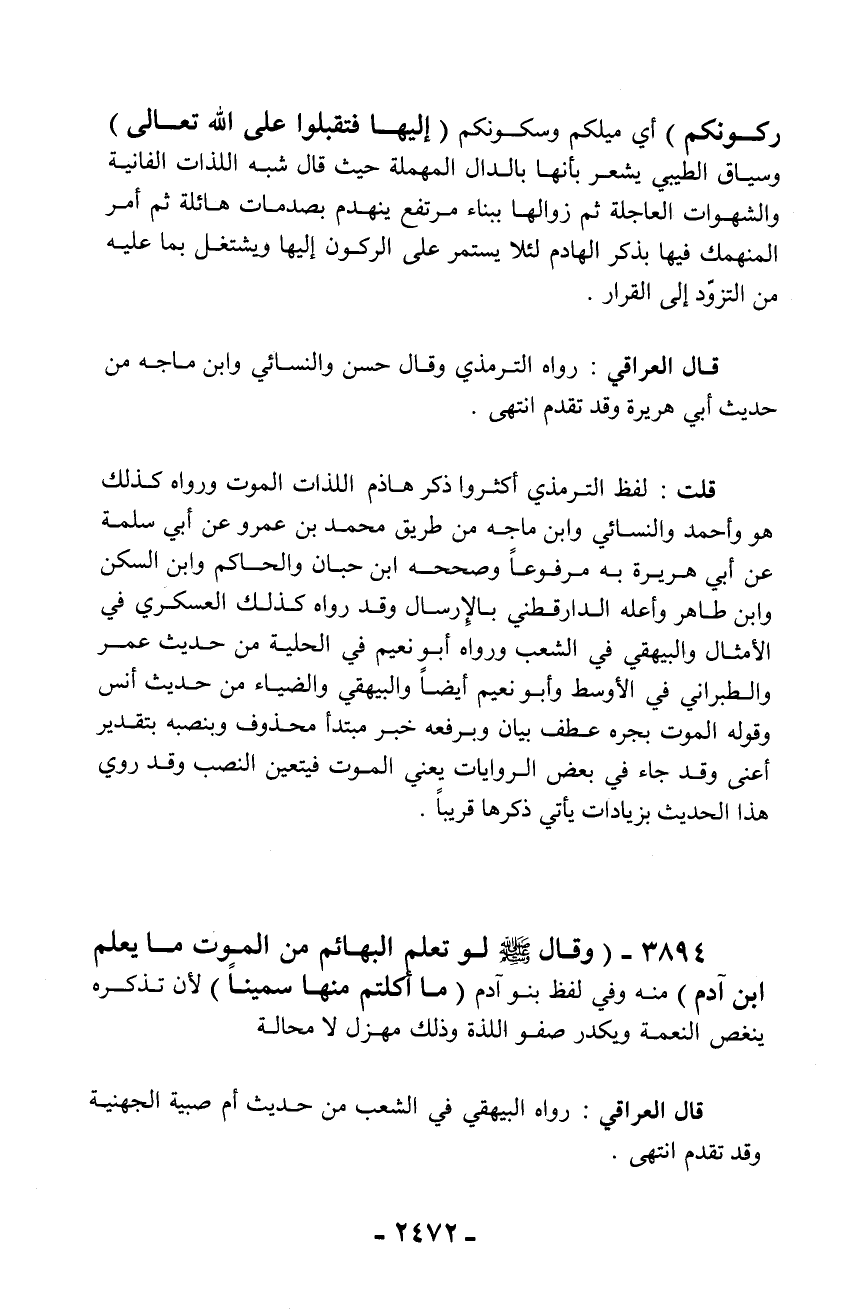 3894 - (وقال - صلّى الله عليه وسلم - لو تعلم البهائم من الموت ما يعلم ابن آدم) منه وفي لفظ بنوآدم (ما أكلتم منها سميناً) لأن تذكره ينغص النعمة ويكدر صفو اللذة وذلك مهزل لا محالة