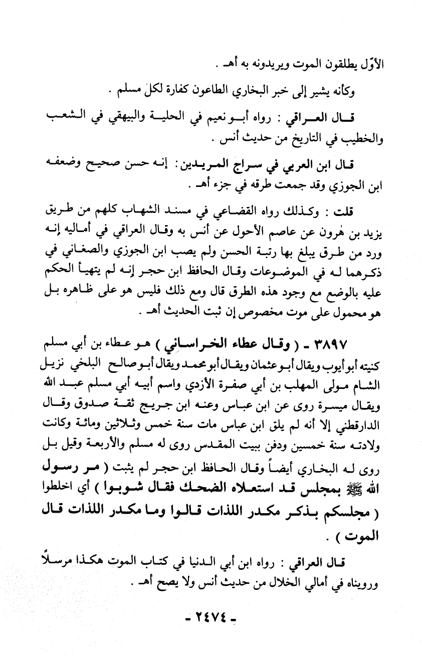 3897 - (وقال عطاء الخراساني) هو عطاء بن أبي مسلم كنيته أبو أيوب ويقال أبو عثمان ويقال أبو محمد ويقال أبو صالح البلخي نزيل الشام مولى المهلب بن أبي صفرة الأزدي واسم أبيه أبي مسلم عبد الله ويقال ميسرة روى عن ابن عباس وعنه ابن جريج ثقة صدوق وقال الدارقطني إلا أنه لم يلق ابن عباس مات سنة خمس وثلاثين ومائة وكانت ولادته سنة خمسين ودفن ببيت المقدس روى له مسلم والأربعة وقيل بل روى له البخاري أيضاً وقال الحافظ ابن حجر لم يثبت (مر رسول الله - صلّى الله عليه وسلم - بمجلس قد استعلاه الضحك فقال شوبوا) أي اخلطوا (مجلسكم بذكر مكدر اللذات قالوا وما مكدر اللذات قال الموت).