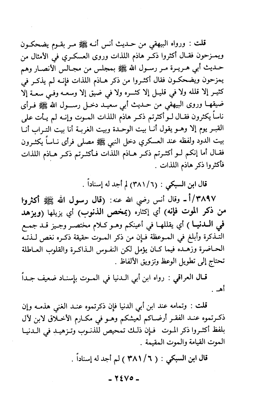قلت: ورواه البيهقي من حديث أنس أنه - صلّى الله عليه وسلم - مر بقوم يضحكون ويمزحون فقال أكثروا ذكر هاذم اللذات وروى العسكري في الأمثال من حديث أبي هريرة مر رسول الله - صلّى الله عليه وسلم - بمجلس من مجالس الأنصار وهم يمزحون ويضحكون فقال أكثروا من ذكر هاذم اللذات فإنه لم يذكر في كثير إلا قلله ولا في قليل إلا كثره ولافي ضيق إلا وسعه وفي سعة إلا ضيقها وروى البيهقي من حديث أبي سعيد دخل رسول الله - صلّى الله عليه وسلم - فرأى ناساً يكثرون فقال لو أكثرتم ذكر هاذم اللذات الموت وإنه لم يأت على القبر يوم إلا وهو يقول أنا بيت الوحدة وبيت الغربة أنا بيت التراب أنا بيت الدود ولفظه عند العسكري دخل النبي - صلّى الله عليه وسلم - مصلى فرأى ناساً يكثرون فقال أما إنكم لو أكثرتم ذكر هاذم اللذات فأكثرتم ذكر هاذم اللذات فأكثروا ذكر هاذم اللذات.