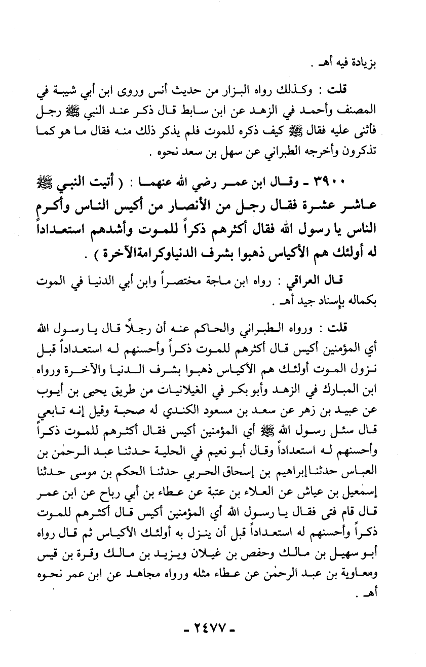 3900 - وقال ابن عمر رضي الله عنهما: (أتيت النبي - صلّى الله عليه وسلم - عاشر عشرة فقال رجل من الأنصار من أكيس الناس وأكرم الناس يا رسول الله فقال أكثرهم ذكراً للموت وأشدهم استعداداً له أولئك هم الأكياس ذهبوا بشرف الدنيا وكرامة الآخرة).