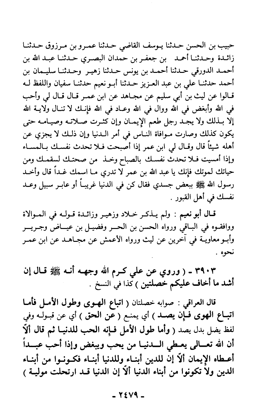حبيب بن الحسن حدثنا يوسف القاضي حدثنا عمرو بن مرزوق حدثنا زائدة وحدثنا أحمد بن جعفر بن حمدان البصري حدثنا عبد الله بن أحمد الدورقي حدثنا أحمد بن يونس حدثنا زهير وحدثنا سليمان بن أحمد حدثنا علي بن عبد العزيز حدثنا أبو نعيم حدثنا سفيان واللفظ له قالوا عن ليث بن أبي سليم عن مجاهد عن ابن عمر قال قال لي وأحب في الله وأبغض في الله ووال في الله وعاد في الله فإنك لا تنال ولاية الله إلا بذلك ولا يجد رجل طعم الإيمان وإن كثرت صلاته وصيامه حتى يكون كذلك وصارت موافاة الناس في أمر الدنيا وإن ذلك لا يجزي عن أهله شيئاً قال وقال لي ابن عمر إذا أصبحت فلا تحدث نفسك بالمساء وإذا أمسيت فلا تحدث نفسك بالصباح وخذ من صحتك لسقمك ومن حياتك لموتك فإنك يا عبد الله بن عمر لا تدري ما اسمك غداً قال وأخذ رسول الله - صلّى الله عليه وسلم - ببعض جسدي فقال كن في الدنيا غريباً أو عابر سبيل وعد نفسك في أهل القبور.