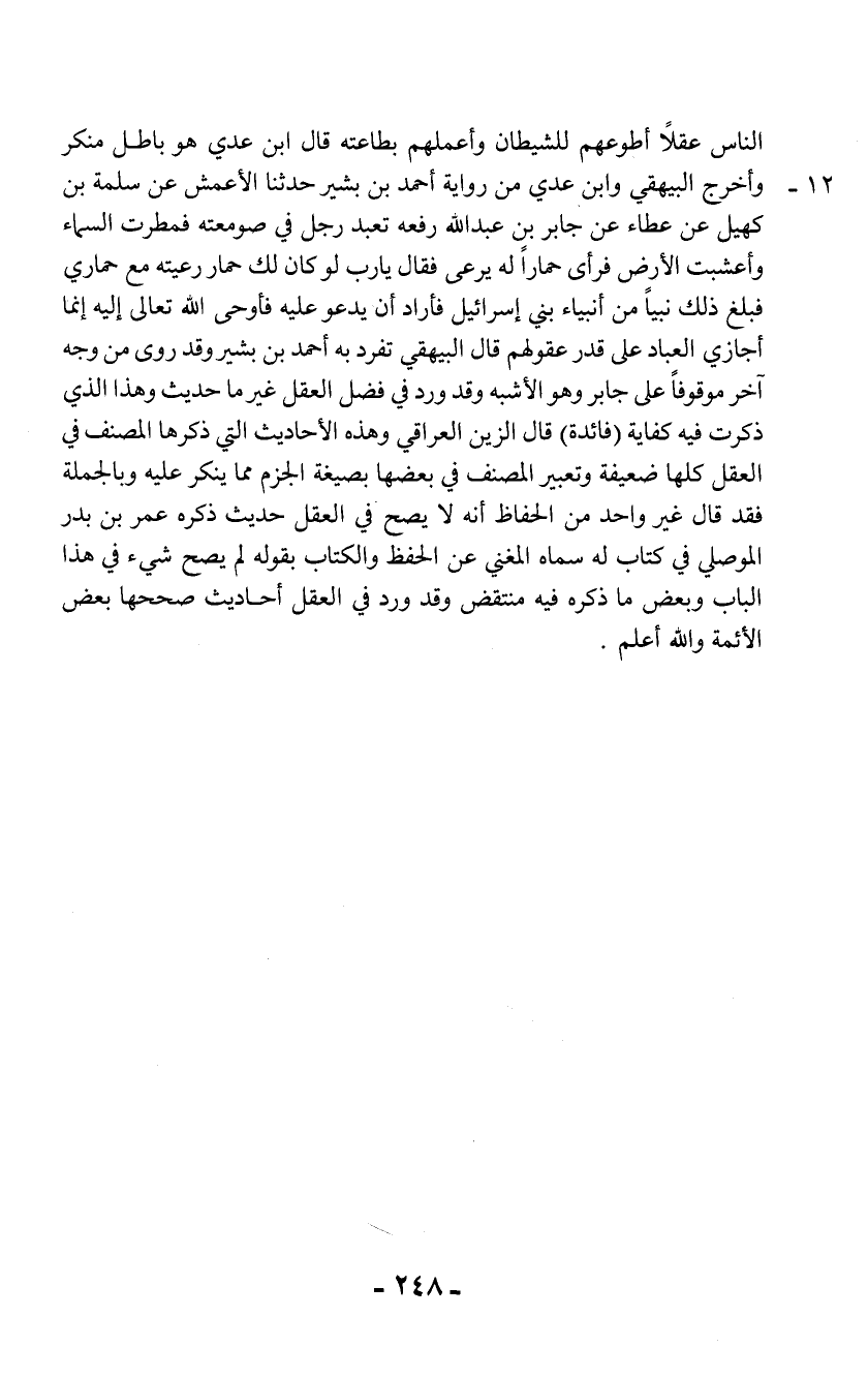 الناس عقلاً أطوعهم للشيطان وأعملهم بطاعته قال ابن عدي هو باطل منكر وأخرج البيهقي وابن عدي من رواية أحمد بن بشير حدثنا الأعمش عن سلمة بن كهيل عن عطاء عن جابر بن عبد الله رفعه تعبد رجل في صومعته فمطرت السماء وأعشبت الأرض فرأى حماراً له يرعى فقال يا رب لو كان لك حمار رعيته مع حماري فبلغ ذلك نبياً من أنبياء بني إسرائيل فأراد أن يدعو عليه فأوحى الله تعالى إليه إنما أجازي العباد على قدر عقولهم قال البيهقي تفرد به أحمد بن بشير وقد روى من وجه آخر موقوفاً على جابر وهو الأشبه وقد ورد في فضل العقل غير ما حديث وهذا الذي ذكرت فيه كفاية (فائدة) قال الزين العراقي وهذه الأحاديث التي ذكرها المصنف في العقل كلها ضعيفة وتعبير المصنف في بعضها بصيغة الجزم مما ينكر عليه وبالجملة فقد قال غير واحد من الحفاظ أنه لا يصح في العقل حديث ذكره عمر بن بدر الموصلي في كتاب له سماه المغني عن الحفظ والكتاب بقوله لم يصح شيء في هذا الباب وبعض ما ذكره فيه منتقض وقد ورد في العقل أحاديث صححها بعض الأئمة والله أعلم.