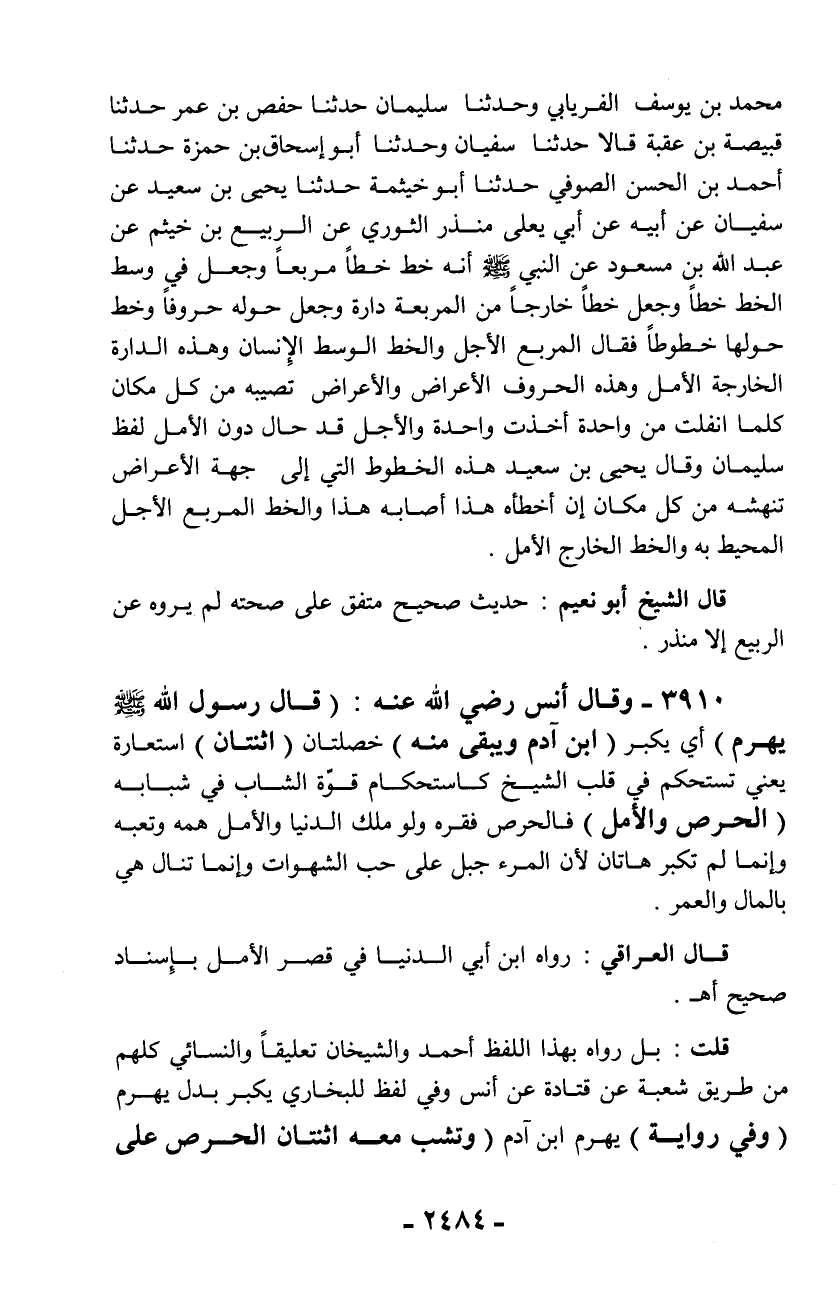 محمد بن يوسف الفريابي وحدثنا سليمان حدثنا حفص بن عمر حدثنا قبيصة بن عقبة قالا حدثنا سفيان وحدثنا أبو إسحاق بن حمزة حدثنا أحمد بن الحسن الصوفي حدثنا أبو خيثمة حدثنا يحيى بن سعيد عن سفيان عن أبيه عن أبي يعلى منذر الثوري عن الربيع بن خيثم عن عبد الله بن مسعود عن النبي - صلّى الله عليه وسلم - أنه خط خطاً مربعاً وجعل في وسط الخط خطاً وجعل خطاً خارجاً من المربعة دارة وجعل حوله حروفاً وخط حولها خطوطاً فقال المربع الأجل والخط الوسط الإنسان وهذه الدارة الخارجة الأمل وهذه الحروف الأعراض والأعراض تصيبه من كل مكان كلما انفلت من واحدة أخذت واحدة والأجل قد حال دون الأمل لفظ سليمان وقال يحيى بن سعيد هذه الخطوط التي إلى جهة الأعراض تنهشه من كل مكان إن أخطأه هذا أصابه هذا والخط المربع الأجل المحيط به والخط الخارج الأمل.