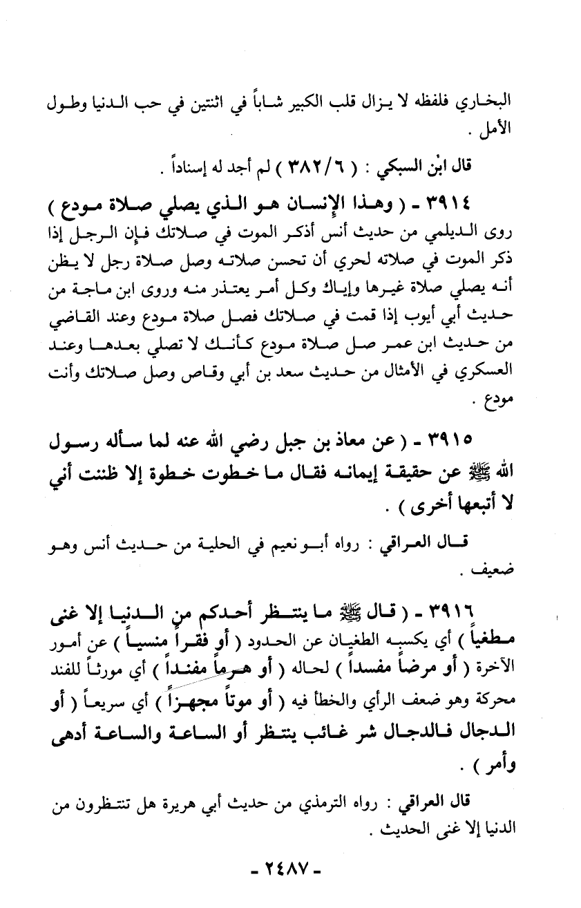 3914 - (وهذا الإنسان هو الذي يصلي صلاة مودع) روى الديلمي من حديث أنس أذكر الموت في صلاتك فإن الرجل إذا ذكر الموت في صلاته لحري أن تحسن صلاته وصل صلاة رجل لا يظن أنه يصلي صلاة غيرها وإياك وكل أمر يعتذر منه وروى ابن ماجة من حديث أبي أيوب إذا قمت في صلاتك فصل صلاة مودع وعند القاضي من حديث ابن عمر صل صلاة مودع كأنك لا تصلي بعدها وعند العسكري في الأمثال من حديث سعد بن أبي وقاص وصل صلاتك وأنت مودع.