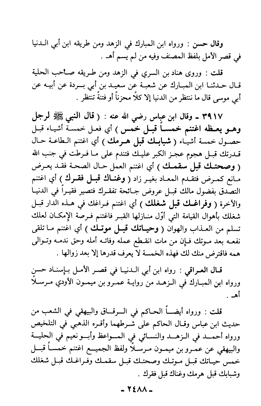 قلت: ورواه أيضاً الحاكم في الرقاق والبيهقي في الشعب من حديث ابن عباس وقال الحاكم على شرطهما وأقره الذهبي في التلخيص ورواه أحمد في الزهد والنسائي في المواعظ وأبو نعيم في الحلية والبيهقي عن عمرو بن ميمون مرسلاً ولفظ الجميع اغتنم خمساً قبل خمس حياتك قبل موتك وصحتك قبل سقمك وفراغك قبل شغلك وشبابك قبل هرمك وغناك قبل فقرك.