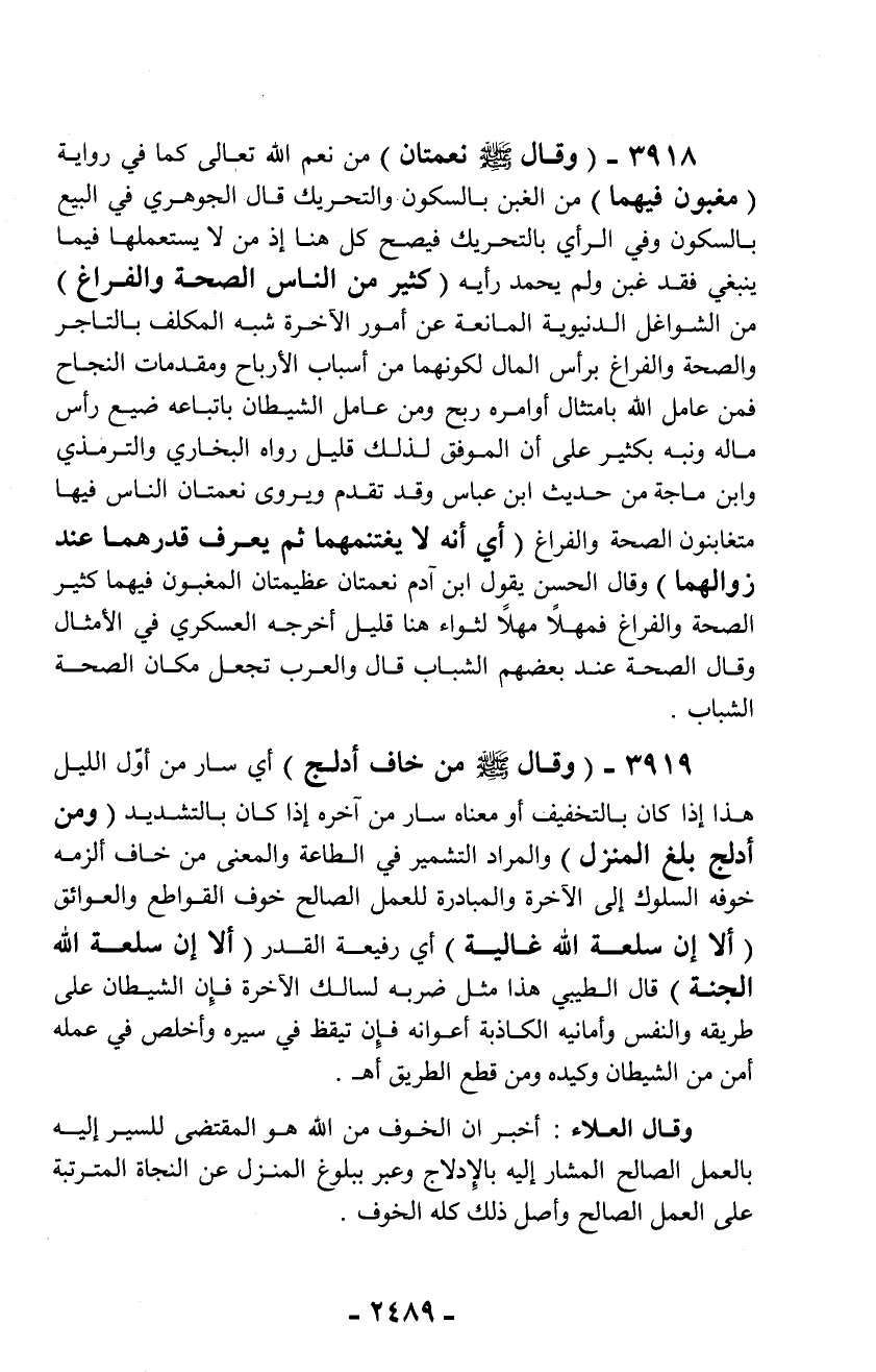 3918 - (وقال - صلّى الله عليه وسلم - نعمتان) من نعم الله تعالى كما في رواية (مغبون فيهما) من الغبن بالسكون والتحريك قال الجوهري في البيع بالسكون وفي الرأي بالتحريك فيصح كل هنا إذ من لا يستعملها فيما ينبغي فقد غبن ولم يحمد رأيه (كثير من الناس الصحة والفراغ) من الشواغل الدنيوية المانعة عن أمور الآخرة شبه المكلف بالتاجر والصحة والفراغ برأس المال لكونهما من أسباب الأرباح ومقدمات النجاح فمن عامل الله بامتثال أوامره ربح ومن عامل الشيطان باتباعه ضيع رأس ماله ونبه بكثير على أن الموفق لذلك قليل رواه البخاري والترمذي وابن ماجة من حديث ابن عباس وقد تقدم ويروى نعمتان الناس فيها متغابنون الصحة والفراغ (أي أنه لا يغتنمهما ثم يعرف قدرهما عند زوالهما) وقال الحسن يقول ابن آدم نعمتان عظيمتان المغبون فيهما كثير الصحة والفراغ فمهلاً مهلاً لثواء هنا قليل أخرجه العسكري في الأمثال وقال الصحة عند بعضهم الشباب قال والعرب تجعل مكان الصحة الشباب.