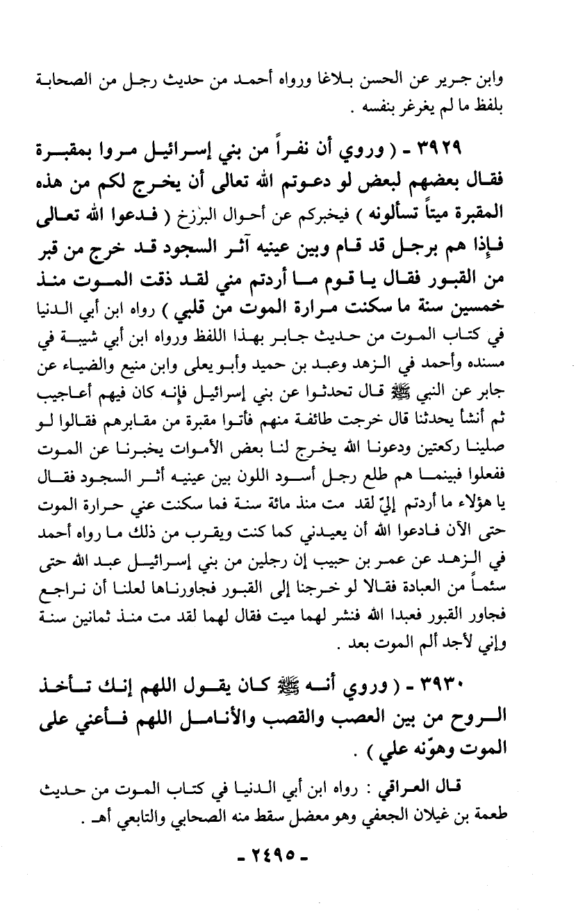 3929 - (وروي أن نفراً من بني إسرائيل مروا بمقبرة فقال بعضهم لبعض لو دعوتم الله تعالى أن يخرج لكم من هذه المقبرة ميتاً تسألونه) فيخبركم عن أحوال البززخ (فدعوا الله تعالى فإذا هم برجل قد قام وبين عينيه أثر السجود قد خرج من قبر من القبور فقال يا قوم ما أردتم مني لقد ذقت الموت منذ خمسين سنة ما سكنت مرارة الموت من قلبي) رواه ابن أبي الدنيا في كتاب الموت من حديث جابر بهذا اللفظ ورواه ابن أبي شيبة في مسنده وأحمد في الزهد وعبد بن حميد وأبو يعلى وابن منيع والضياء عن جابر عن النبي - صلّى الله عليه وسلم - قال تحدثوا عن بني إسرائيل فإنه كان فيهم أعاجيب ثم أنشأ يحدثنا قال خرجت طائفة منهم فأتوا مقبرة من مقابرهم فقالوا لو صلينا ركعتين ودعونا الله يخرج لنا بعض الأموات يخبرنا عن الموت ففعلوا فبينما هم طلع رجل أسود اللون بين عينيه أثر السجود فقال يا هؤلاء ما أردتم إليّ لقد مت منذ مائة سنة فما سكنت عني حرارة الموت حتى الآن فادعوا الله أن يعيدني كما كنت ويقرب من ذلك ما رواه أحمد في الزهد عن عمر بن حبيب إن رجلين من بني إسرائيل عبد الله حتى سئما من العبادة فقالا لو خرجنا إلى القبور فجاورناها لعلنا أن نراجع فجاور القبور فعبدا الله فنشر لهما ميت فقال لهما لقد مت منذ ثمانين سنة وإني لأجد ألم الموت بعد.