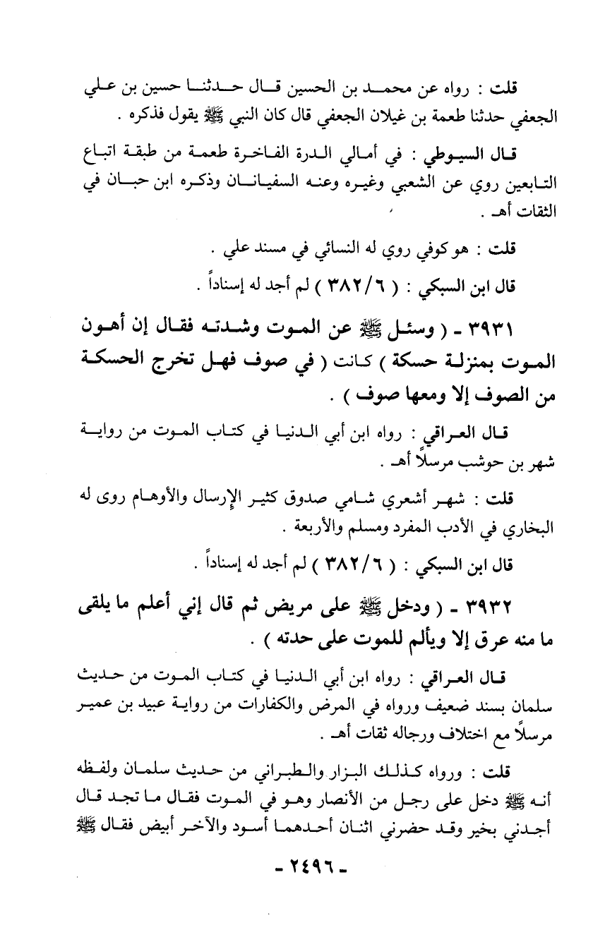 3931 - (وسئل - صلّى الله عليه وسلم - عن الموت وشدته فقال إن أهون الموت بمنزلة حسكة) كانت (في صوف فهل تخرج الحسكة من الصوف إلا ومعها صوف).