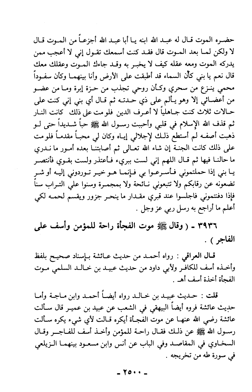 3936 - (وقال - صلّى الله عليه وسلم - موت الفجأة راحة للمؤمن وأسف على الفاجر).