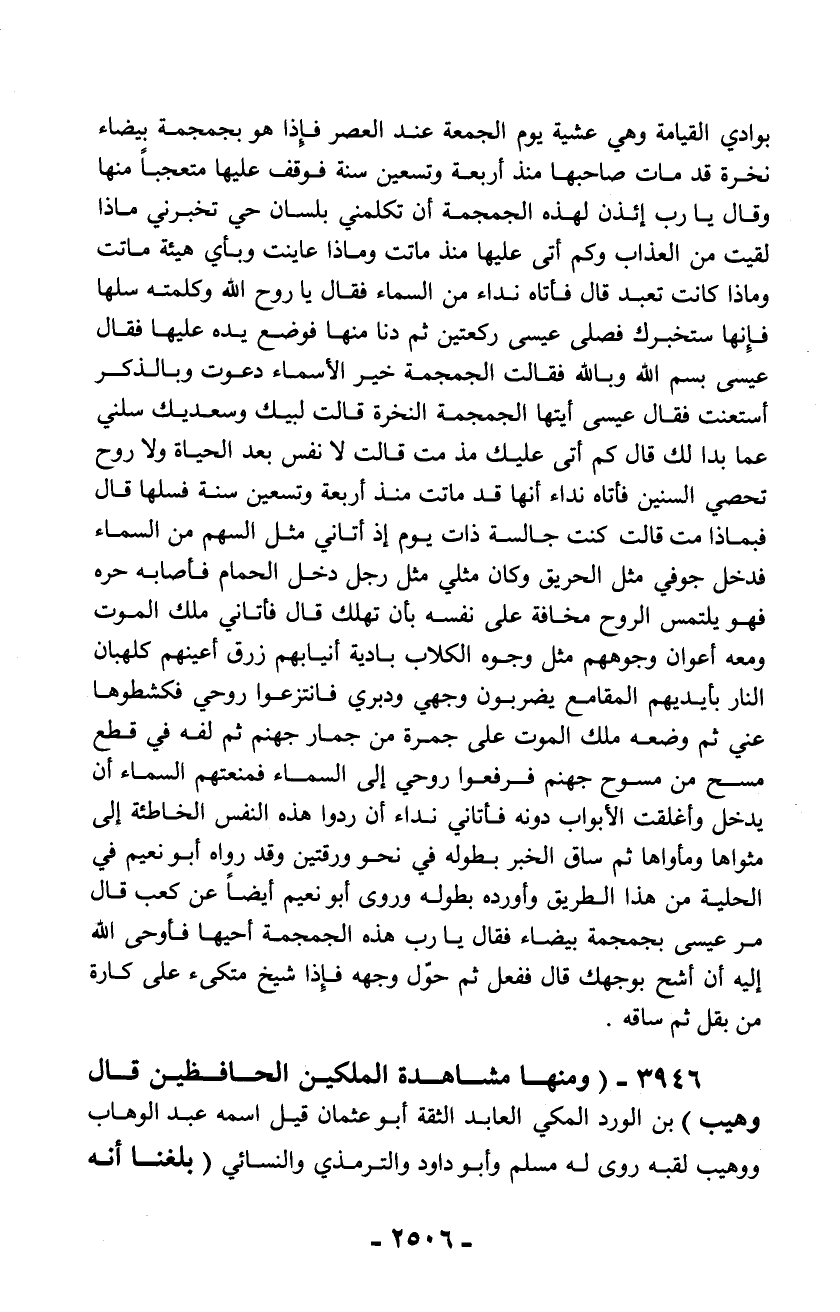بوادي القيامة وهي عشية يوم الجمعة عند العصر فإذا هو بجمجمة بيضاء نخرة قد مات صاحبها منذ أربعة وتسعين سنة فوقف عليها متعجباً منها وقال يا رب إئذن لهذه الجمجمة أن تكلمني بلسان حي تخبرني ماذا لقيت من العذاب وكم أتى عليها منذ ماتت وماذا عاينت وبأي هيئة ماتت وماذا كانت تعبد قال فأتاه نداء من السماء فقال يا روح الله وكلمته سلها فإنها ستخبرك فصلى عيسى ركعتين ثم دنا منها فوضع يده عليها فقال عيسى بسم الله وبالله فقالت الجمجمة خير الأسماء دعوت وبالذكر استعنت فقال عيسى أيتها الجمجمة النخرة قالت لبيك وسعديك سلني عما بدا لك قال كم أتى عليك مذ مت قالت لا نفس بعد الحياة ولا روح تحصي السنين فأتاه نداء أنها قد ماتت منذ أربعة وتسعين سنة فسلها قال فبماذا مت قالت كنت جالسة ذات يوم إذ أتاني مثل السهم من السماء فدخل جوفي مثل الحريق وكان مثلي مثل رجل دخل الحمام فأصابه حره فهو يلتمس الروح مخافة على نفسه بأن تهلك قال فأتاني ملك الموت ومعه أعوان وجوههم مثل وجوه الكلاب بادية أنيابهم زرق أعينهم كلهبان النار بأيديهم المقامع يضربون وجهي ودبري فانتزعوا روحي فكشطوها عني ثم وضعه ملك الموت على جمرة من جمار جهنم ثم لفه في قطع مسح من مسوح جهنم فرفعوا روحي إلى السماء فمنعتهم السماء أن يدخل وأغلقت الأبواب دونه فأتاني نداء أن ردوا هذه النفس الخاطئة إلى مثواها ومأواها ثم ساق الخبر بطوله في نحو ورقتين وقد رواه أبو نعيم في الحلية من هذا الطريق وأورده بطوله وروى أبو نعيم أيضاً عن كعب قال مر عيسى بجمجمة بيضاء فقال يا رب هذه الجمجمة أحيها فأوحى الله إليه أن أشح بوجهك قال ففعل ثم حوّل وجهه فإذا شيخ متكئ على كارة من بقل ثم ساقه.