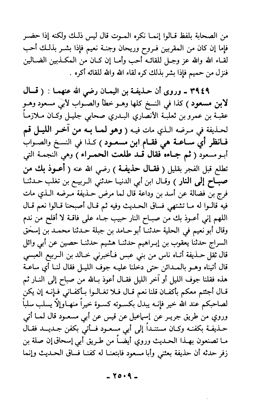 3949 - وروى أن حذيفة بن اليمان رضي الله عنهما: (قال لابن مسعود) كذا في النسخ كلها وهو خطأ والصواب لأبي مسعود وهو عقبة بن عمرو بن ثعلبة الأنصاري البدري صحابي جليل وكان ملازماً لحذيفة في مرضه الذي مات فيه (وهو لما به من آخر الليل قم فانظر أي ساعة هي فقام ابن مسعود) كذا في النسخ والصواب أبو مسعود (ثم جاءه فقال قد طلعت الحمراء) وهي النجمة التي تطلع قبل الفجر بقليل (فقال حذيفة) رضي الله عنه (أعوذ بك من صباح إلى النار) وقال ابن أبي الدنيا حدثني الربيع بن تغلب حدثنا فرج بن فضالة عن أسد بن وداعة قال لما مرض حذيفة مرضه الذي مات فيه قالوا له ما تشتهي فساق الحديث وفيه ثم قال أصبحنا قالوا نعم قال اللهم إني أعوذ بك من صباح النار حبيب جاء على فاقة لا أفلح من ندم وقال أبو نعيم في الحلية حدثنا أبو حامد بن جبلة حدثنا محمد بن إسحاق السراج حدثنا يعقوب بن إبراهيم حدثنا هشيم حدثنا حصين عن أبي وائل قال ثقل حذيفة أتاه ناس من بني عبس فأخبرني خالد بن الربيع العبسي قال أتيناه وهو بالمدائن حتى دخلنا عليه جوف الليل فقال لنا أي ساعة هذه فقلنا جوف الليل أو آخر الليل فقال أعوذ بالله من صباح إلى النار ثم قال أجئتم معكم بأكفان قلنا نعم قال فلا تغالوا بأكفاني فإنه إن يكن لصاحبكم عند الله خير فإنه يبدل بكسوته كسوة خيراً منها وإلاّ يسلب سلباً وروي من طريق جرير عن إسماعيل عن قيس عن أبي مسعود قال لما أتي حذيفة بكفنه وكان مستنداً إلى أبي مسعود فأتي بكفن جديد فقال ما تصنعون بهذا الحديث وروي أيضاً من طريق أبي إسحاق إن صلة بن زفر حدثه أن حذيفة بعثني وأبا مسعود فابتعنا له كفنا فساق الحديث وإنما