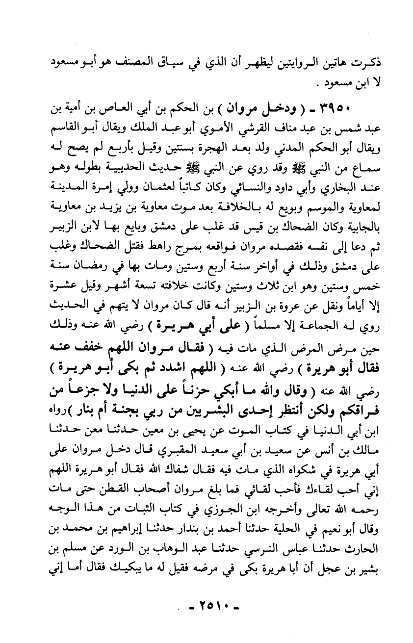 3950 - (ودخل مروان) بن الحكم بن أبي العاص بن أمية بن عبد شمس بن عبد مناف القرشي الأموي أبو عبد الملك ويقال أبو القاسم ويقال أبو الحكم المدني ولد بعد الهجرة بسنتين وقيل بأربع لم يصح له سماع من النبي - صلّى الله عليه وسلم - وقد روي عن النبي - صلّى الله عليه وسلم - حديث الحديبية بطوله وهو عند البخاري وأبي داود والنسائي وكان كاتباً لعثمان وولي إمرة المدينة لمعاوية والموسم وبويع له بالخلافة بعد موت معاوية بن يزيد بن معاوية بالجابية وكان الضحاك بن قيس قد غلب على دمشق وبايع بها لابن الزبير ثم دعا إلى نفسه فقصده مروان فواقعه بمرج راهط فقتل الضحاك وغلب على دمشق وذلك في أواخر سنة أربع وستين ومات بها في رمضان سنة خمس وستين وهو ابن ثلاث وستين وكانت خلافته تسعة أشهر وقيل عشرة إلا أياماً ونقل عن عروة بن الزبير أنه قال كان مروان لا يتهم في الحديث روي له الجماعة إلا مسلماً (على أبي هريرة) رضي الله عنه وذلك حين مرض المرض الذي مات فيه (فقال مروان اللهم خفف عنه فقال أبو هريرة) رضي الله عنه (اللهم اشدد ثم بكى أبو هريرة) رضي الله عنه (وقال والله ما أبكي حزناً على الدنيا ولا جزعاً من فراقكم ولكن أنتظر إحدى البشريين من ربي بجنة أم بنار) رواه ابن أبي الدنيا في كتاب الموت عن يحيى بن معين حدثنا معن حدثنا مالك بن أنس عن سعيد بن أبي سعيد المقبري قال دخل مروان على أبي هريرة في شكواه الذي مات فيه فقال شفاك الله فقال أبو هريرة اللهم إني أحب لقاءك فأحب لقائي فما بلغ مروان أصحاب القطن حتى مات رحمه الله تعالى وأخرجه ابن الجوزي في كتاب الثبات من هذا الوجه وقال أبو نعيم في الحلية حدثنا أحمد بن بندار حدثنا إبراهيم بن محمد بن الحارث حدثنا عباس النرسي حدثنا عبد الوهاب بن الورد عن مسلم بن بشير بن عجل أن أبا هريرة بكى في مرضه فقيل له ما يبكيك فقال أما إني