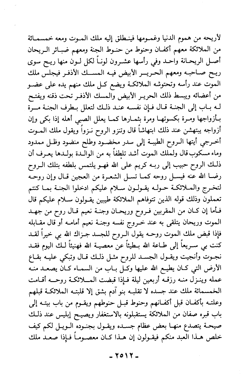 لأريحه من هموم الدنيا وغمومها فينطلق إليه ملك الموت ومعه خمسمائة من الملائكة معهم أكفان وحنوط من حنوط الجنة ومعهم ضبائر الريحان أصل الريحانة واحد وفي رأسها عشرون لوناً لكل لون منها ريح سوى ريح صاحبه ومعهم الحرير الأبيض فيه المسك الأذفر فيجلس ملك الموت عند رأسه وتحتوشه الملائكة ويضع كل ملك منهم يده على عضو من أعضائه ويبسط ذلك الحرير الأبيض والمسك الأذفر تحت ذقنه ويفتح له باب إلى الجنة قال فإن نفسه عند ذلك لتعلل بطرف الجنة مرة بأزواجها ومرة بكسوتها ومرة بثمارها كما يعلل الصبي أهله إذا بكى وإن أزواجه يبتهشن عند ذلك ابتهاشاً قال وتنزو الروح نزواً ويقول ملك الموت أخرجي أيتها الروح الطيبة إلى سدر مخضود وطلح منضود وظل ممدود وماء مسكوب قال ولملك الموت أشد تلطفاً به من الوالدة بولدها يعرف أن ذلك الروح حبيب إلى ربه كريم على الله فهو يلتمس بلطفه بتلك الروح رضا الله عنه فيسل روحه كما تسل الشعرة من العجين قال وإن روحه لتخرج والملائكة حوله يقولون سلام عليكم ادخلوا الجنة بما كنتم تعملون وذلك قوله الذين تتوفاهم الملائكة طيبين يقولون سلام عليكم قال فأما إن كان من المقربين فروح وريحان وجنة نعيم قال روح من جهد الموت وريحان يتلقى به عند خروج نفسه وجنة نعيم أمامه أو قال مقابله فإذا قبض ملك الموت روحه يقول الروح للجسد جزاك الله بي خيراً لقد كنت بي سريعاً إلى طاعة الله بطيئاً عن معصية الله فهنيئاً لك اليوم فقد نجوت وأنجيت ويقول الجسد للروح مثل ذلك قال وتبكي عليه بقاع الأرض التي كان يطيع الله عليها وكل باب من السماء كان يصعد منه عمله وينزل منه رزقه أربعين ليلة فإذا قبضت الملائكة روحه أقامت الخمسمائة ملك عند جسده لا تقلبه بنو آدم بشق إلا قلبته الملائكة قبلهم وعلته بأكفان قبل أكفانهم وحنوط قبل حنوطهم ويقوم من باب بيته إلى باب قبره صفان من الملائكة يستقبلونه بالاستغفار ويصيح إبليس عند ذلك صيحة يتصدع منها بعض عظام جسده ويقول بجنوده الويل لكم كيف خلص هذا العبد منكم فيقولون إن هذا كان معصوماً فإذا صعد ملك