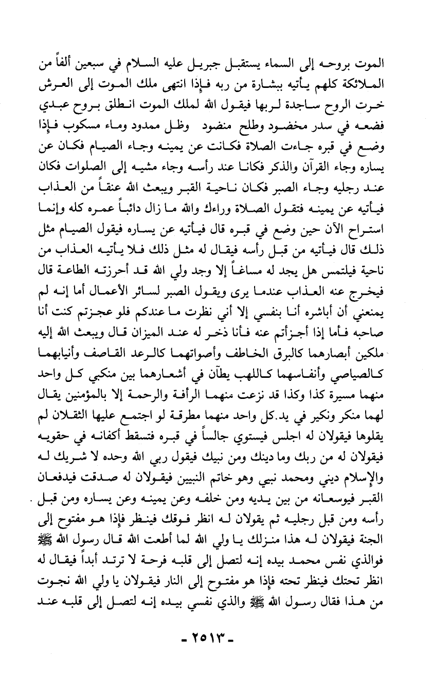 الموت بروحه إلى السماء يستقبل جبريل عليه السلام في سبعين ألفاً من الملائكة كلهم يأتيه ببشارة من ربه فإذا انتهى ملك الموت إلى العرش خرت الروح ساجدة لربها فيقول الله لملك الموت انطلق بروح عبدي فضعه في سدر مخضود وطلح منضود وظل ممدود وماء مسكوب فإذا وضع في قبره جاءت الصلاة فكانت عن يمينه وجاء الصيام فكان عن يساره وجاء القرآن والذكر فكانا عند رأسه وجاء مشيه إلى الصلوات فكان عند رجليه وجاء الصبر فكان ناحية القبر ويبعث الله عنقاً من العذاب فيأتيه عن يمينه فتقول الصلاة وراءك والله ما زال دائباً عمره كله وإنما استراح الآن حين وضع في قبره قال فيأتيه عن يساره فيقول الصيام مثل ذلك قال فيأتيه من قبل رأسه فيقال له مثل ذلك فلا يأتيه العذاب من ناحية فيلتمس هل يجد له مساغاً إلا وجد ولي الله قد أحرزته الطاعة قال فيخرج عنه العذاب عندما يرى ويقول الصبر لسائر الأعمال أما إنه لم يمنعني أن أباشره أنا بنفسي إلا أني نظرت ما عندكم فلو عجزتم كنت أنا صاحبه فأما إذا أجزأتم عنه فأنا ذخر له عند الميزان قال ويبعث الله إليه ملكين أبصارهما كالبرق الخاطف وأصواتهما كالرعد القاصف وأنيابهما كالصياصي وأنفاسهما كاللهب يطآن في أشعارهما بين منكبي كل واحد منهما مسيرة كذا وكذا قد نزعت فنهما الرأفة والرحمة إلا بالمؤمنين يقال لهما منكر ونكير في يد كل واحد منهما مطرقة لو اجتمع عليها الثقلان لم يقلوها فيقولان له اجلس فيستوي جالساً في قبره فتسقط أكفانه في حقويه فيقولان له من ربك وما دينك ومن نبيك فيقول ربي الله وحده لا شريك له والإسلام ديني ومحمد نبيي وهو خاتم النبيين فيقولان له صدقت فيدفعان القبر فيوسعانه من بين يديه ومن خلفه وعن يمينه وعن يساره ومن قبل رأسه ومن قبل رجليه ثم يقولان له انظر فوقك فينظر فإذا هو مفتوح إلى الجنة فيقولان له هذا منزلك يا ولي الله لما أطعت الله قال رسول الله - صلّى الله عليه وسلم - فوالذي نفس محمد بيده إنه لتصل إلى قلبه فرحة لا ترتد أبداً فيقال له انظر تحتك فينظر تحته فإذا هو مفتوح إلى النار فيقولان يا ولي الله نجوت من هذا فقال رسول الله - صلّى الله عليه وسلم - والذي نفسي بيده إنه لتصل إلى قلبه عند