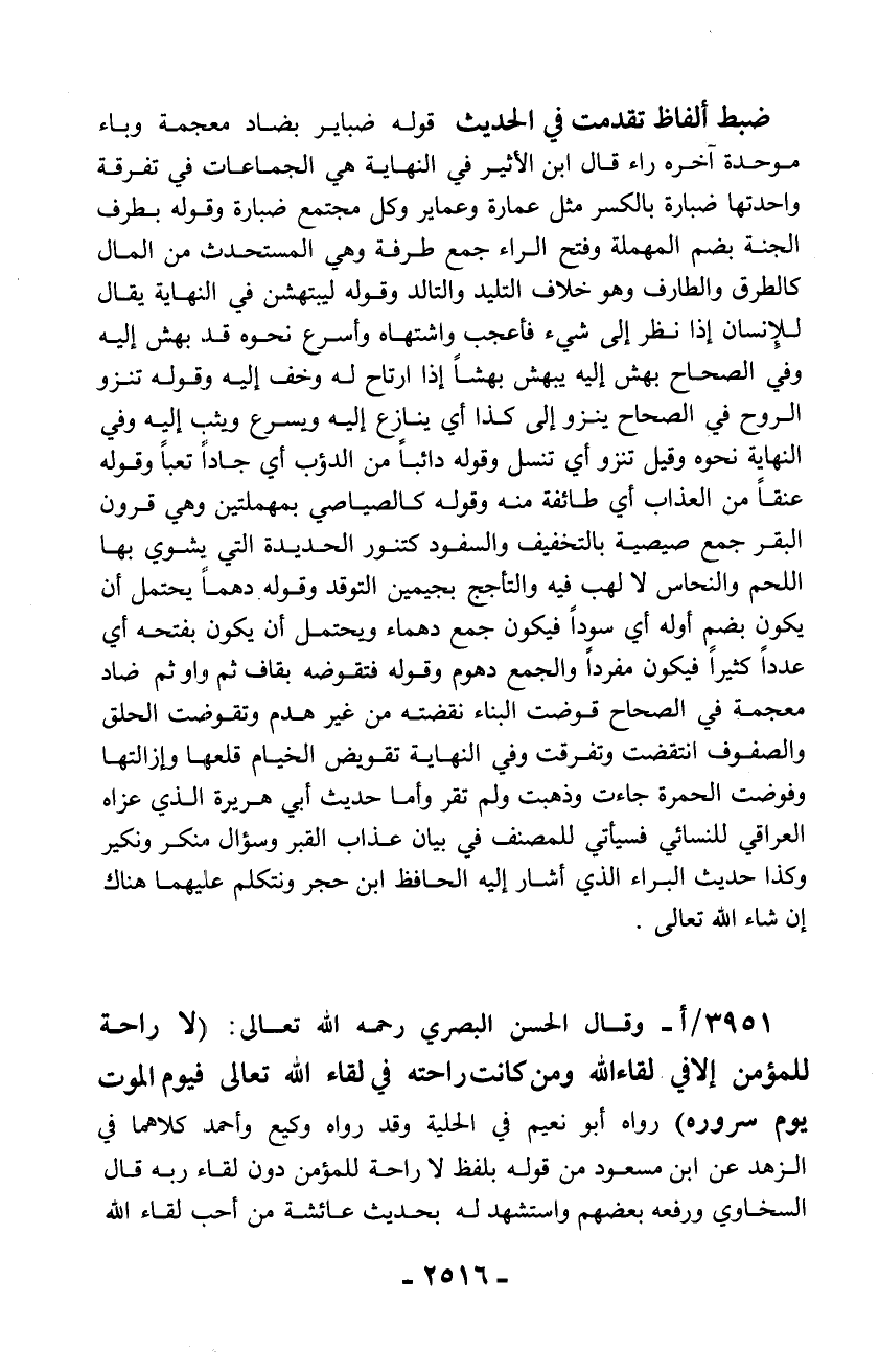 ضبط ألفاظ تقدمت في الحديث قوله ضباير بضاد معجمة وباء موحدة آخره راء قال ابن الأثير في النهاية هي الجماعات في تفرقة واحدتها ضبارة بالكسر مثل عمارة وعماير وكل مجتمع ضبارة وقوله بطرف الجنة بضم المهملة وفتح الراء جمع طرفة وهي المستحدث من المال كالطرق والطارف وهو خلاف التليد والتالد وقوله ليبتهشن في النهاية يقال للإنسان إذا نظر إلى شيء فأعجب واشتهاه وأسرع نحوه قد بهش إليه وفي الصحاح بهش إليه يبهش بهشاً إذا ارتاح له وخف إليه قوله تنزو الروح في الصحاح ينزو إلى كذا أي ينازع إليه ويسرع ويثب إليه وفي النهاية نحوه وقيل تنزو أي تنسل وقوله دائباً من الدؤب أي جاداً تعباً وقوله عنقاً من العذاب أي طائفة منه وقوله كالصياصي بمهملتين وهي قرون البقر جمع صيصية بالتخفيف والسفود كتنور الحديدة التي يشوي بها اللحم والنحاس لا لهب فيه والتأجج بجيمين التوقد وقوله دهماً يحتمل أن يكون بضم أوله أي سوداً فيكون جمع دهماء ويحتمل أن يكون بفتحه أي عدداً كثيراً فيكون مفرداً والجمع دهوم وقوله فتقوضه بقاف ثم واو ثم ضاد معجمة في الصحاح قوضت البناء نقضته من غير هدم وتقوضت الحلق والصفوف انتقضت وتفرقت وفي النهاية تقويض الخيام قلعها وإزالتها وفوضت الحمرة جاءت وذهبت ولم تقر وأما حديث أبي هريرة الذي عزاه العراقي للنسائي فسيأتي للمصنف في بيان عذاب القبر وسؤال منكر ونكير وكذا حديث البراء الذي أشار إليه الحافظ ابن حجر ونتكلم عليهما هناك إن شاء الله تعالى.