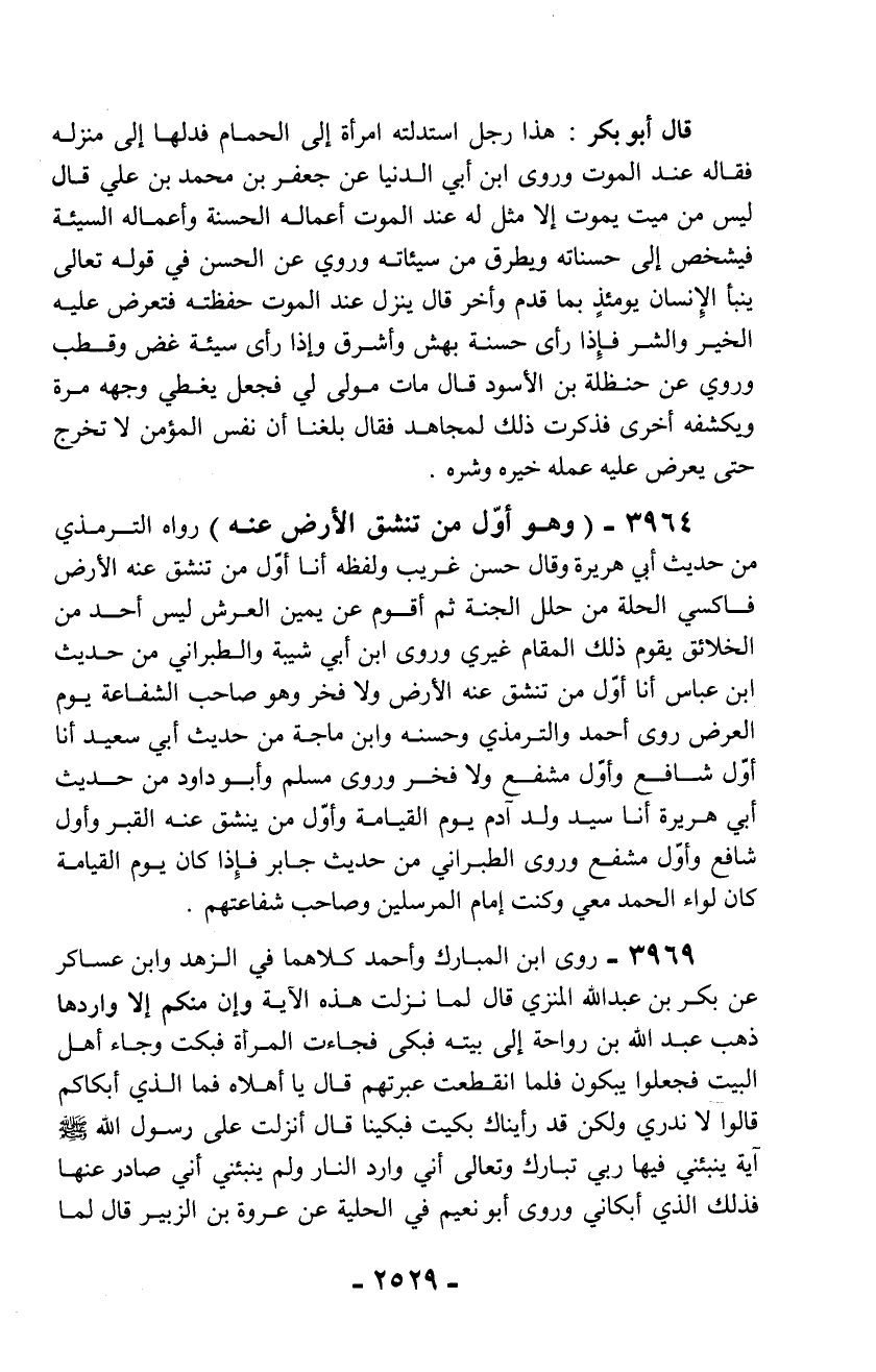 3969 - روى ابن المبارك وأحمد كلاهما في الزهد وابن عساكر عن بكر بن عبد الله المنزي قال لما نزلت هذه الآية وإن منكم إلا واردها ذهب عبد الله بن رواحة إلى بيته فبكى فجاءت المرآة فبكت وجاء أهل البيت فجعلوا يبكون فلما انقطعت عبرتهم قال يا أهلاه فما الذي أبكاكم قالوا لا ندري ولكن قد رأيناك بكيت فبكينا قال أنزلت على رسول الله - صلّى الله عليه وسلم - آية ينبئني فيها ربي تبارك وتعالى أني وارد النار ولم ينبئني أني صادر عنها فذلك الذي أبكاني وروى أبو نعيم في الحلية عن عروة بن الزبير قال لما