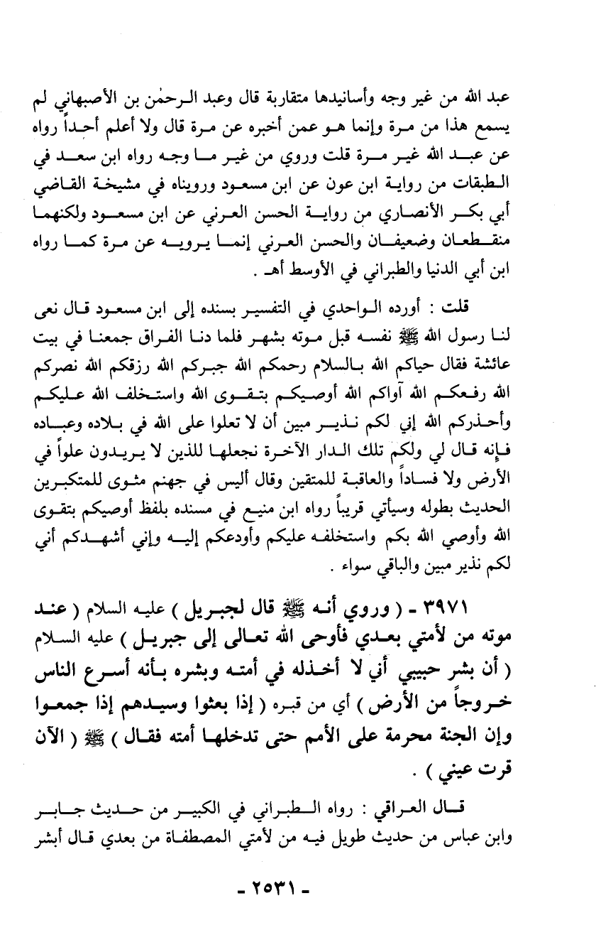 عبد الله من غير وجه وأسانيدها متقاربة قال وعبد الرحمن بن الأصبهاني لم يسمع هذا من مرة وإنما هو عمن أخبره عن مرة قال ولا أعلم أحداً رواه عن عبد الله غير مرة قلت وروي من غير ما وجه رواه ابن سعد في الطبقات من رواية ابن عون عن ابن مسعود ورويناه في مشيخة القاضي أبي بكر الأنصاري من رواية الحسن العرني عن ابن مسعود ولكنهما منقطعان وضعيفان والحسن العرني إنما يرويه عن مرة كما رواه ابن أبي الدنيا والطبراني في الأوسط أهـ.