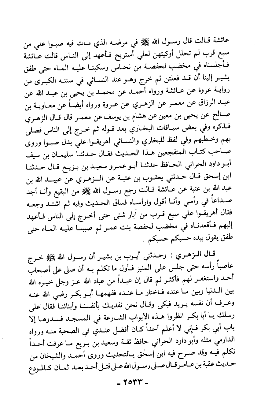 عائشة قالت قال رسول الله - صلّى الله عليه وسلم - في مرضه الذي مات فيه صبوا علي من سبع قرب لم تحلل أوكيتهن لعلي أستريح فأعهد إلى الناس قالت عائشة فأجلسناه في مخضب لحفصة من نحاس وسكبنا عليه الماء حتى طفق يشير إلينا أن قد فعلتن ثم خرج وهو عند النسائي في سننه الكبرى من رواية عروة عن عائشة ورواه أحمد عن محمد بن يحيى بن عبد الله عن عبد الرزاق عن معمر عن الزهري عن عروة ورواه أيضاً عن معاوية بن صالح عن يحيى بن معين عن هشام بن يوسف عن معمر قال قال الزهري فذكره وفي بعض سياقات البخاري بعد قوله ثم خرج إلى الناس فصلى بهم وخطبهم وفي لفظ للبخاري والنسائي أهريقوا علي بدل صبوا وروى صاحب كتاب المتفجعين هذا الحديث فقال حدثنا سليمان بن سيف أبو داود الحراني الحافظ حدثنا أبو عمرو سعيد بن بزيع قال حدثنا ابن إسحاق قال حدثني يعقوب بن عتبة عن الزهري عن عبيد الله بن عبد الله بن عتبة عن عائشة قالت رجع رسول الله - صلّى الله عليه وسلم - من البقيع وأنا أجد صداعاً في رأسي وأنا أقول وارأساه فساق الحديث وفيه ثم اشتد وجعه فقال أهريقوا علي سبع قرب من آبار شتى حتى أخرج إلى الناس فأعهد إليهم فأقعدناه في مخضب لحفصة بنت عمر ثم صببنا عليه الماء حتى طفق يقول بيده حسبكم حسبكم.