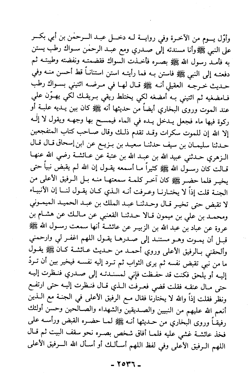 وأوّل يوم من الآخرة وفي رواية له دخل عبد الرحمن بن أبي بكر على النبي - صلّى الله عليه وسلم - وأنا مسندته إلى صدري ومع عبد الرحمن سواك رطب يستن به فأمد رسول الله - صلّى الله عليه وسلم - بصره فأخذت السواك فقضمته ونفضته وطيبته ثم دفعته إلى النبي - صلّى الله عليه وسلم - فاستن به فما رأيته استن استناناً قط أحسن منه وفي حديث خرجه العقيلي أنه - صلّى الله عليه وسلم - قال لها في مرضه ائتيني بسواك رطب فامضغيه ثم ائتيني به أمضغه لكي يختلط ريقي بريقك لكي يهوّن علي عند الموت وروى البخاري أيضاً من حديثها أنه - صلّى الله عليه وسلم - كان بين يديه علبة أو ركوة فيها ماء فجعل يدخل يده في الماء فيمسح بها وجهه ويقول لا إله إلا الله إن للموت سكرات وقد تقدم ذلك وقال صاحب كتاب المتفجعين حدثنا سليمان بن سيف حدثنا سعيد بن بزيع عن ابن إسحاق قال قال الزهري حدثني عبيد الله بن عبد الله بن عتبة عن عائشة رضي الله عنها قالت كان رسول الله - صلّى الله عليه وسلم - كثيراً ما أسمعه يقول إن الله لم يقبض نبياً حتى يخير فلما حضر - صلّى الله عليه وسلم - كان آخر كلمة سمعتها منه بل الرفيق الأعلى من الجنة قلت إذاً لا يختارنا وعرفت أنه الذي كان يقول لنا إن الأنبياء لا تقبض حتى تخير قال وحدثنا عبد الملك بن عبد الحميد الميموني ومحمد بن علي بن ميمون قالا حدثنا القعنبي عن مالك عن هشام بن عروة عن عباد بن عبد الله بن الزبير عن عائشة أنها سمعت رسول الله - صلّى الله عليه وسلم - قبل أن يموت وهو مستند إلى صدرها يقول اللهم اغفر لي وارحمني وألحقني بالرفيق الأعلى وروي أحمد من حديث عائشة كان - صلّى الله عليه وسلم - يقول ما من نبي تقبض نفسه ثم يرى الثواب ثم ترد إليه نفسه فيخير بين أن تردّ إليه أو يلحق فكنت قد حفظت فإني لمسندته إلى صدري فنظرت إليه حتى مال عنقه فقلت قضي فعرفت الذي قال فنظرت إليه حتى ارتفع ونظر فقلت إذاً والله لا يختارنا فقال مع الرفيق الأعلى في الجنة مع الذين أنعم الله عليهم من النبيين والصديقين والشهداء والصالحين وحسن أولئك رفيقاً وروى البخاري من حديثها أنه - صلّى الله عليه وسلم - لما حضره القبض ورأسه على فخذ عائشة غشي عليه فلما أفاق شخص بصره نحو سقف البيت ثم قال اللهم الرفيق الأعلى وفي لفظ اللهم أسألك أو أسأل الله الرفيق الأعلى