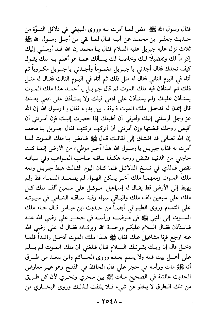 فقال رسول الله - صلّى الله عليه وسلم - امض لما أمرت به وروى البيهقي في دلائل النبوّة من حديث جعفر بن محمد عن أبيه قال لما بقي من أجل رسول الله - صلّى الله عليه وسلم - ثلاث نزل عليه جبريل عليه السلام فقال يا محمد إن الله قد أرسلني إليك إكراماً لك وتفضيلاً لك وخاصة لك يسألك عما هو أعلم به منك يقول كيف تجدك فقال أجدني يا جبريل مغموماً وأجدني يا جبريل مكروباً ثم أتاه في اليوم الثاني فقال له مثل ذلك ثم أتاه في اليوم الثالث فقال له مثل ذلك ثم استأذن فيه ملك الموت ثم قال جبريل يا أحمد هذا ملك الموت يستأذن عليك ولم يستأذن على آدمي قبلك ولا يستأذن على آدمي بعدك قال إئذن له فدخل ملك الموت فوقف بين يديه فقال يا رسول الله إن الله عز وجل أرسلني إليك وأمرني أن أطيعك إذا حضرت إليك فإن أمرتني أن أقبض روحك قبضتها وإن أمرتني أن أتركها تركتها فقال جبريل يا محمد إن الله تعالى قد اشتاق إلى لقائك قال - صلّى الله عليه وسلم - فامض يا ملك الموت لما أمرت به فقال جبريل يا رسول الله هذا آخر موطئ من الأرض إنما كنت حاجتي من الدنيا فقبض روحه هكذا ساقه صاحب المواهب وفي سياقه نقص فالذي في نسخ الدلائل فلما كان اليوم الثالث هبط جبريل ومعه ملك الموت ومعهما ملك آخر يسكن الهواء لم يصعد السماء قط ولم يهبط إلى الأرض قط يقال له إسماعيل موكل على سبعين ألف ملك كل ملك على سبعين ألف ملك والباقي سواء وقد ساقه الشامي في سيرته على التمام وروى الطبراني أيضاً من حديث ابن عباس قال جاء ملك الموت إلى النبي - صلّى الله عليه وسلم - في مرضه ورأسه في حجر علي رضي الله عنه فاستأذن فقال السلام عليكم ورحمة الله وبركاته فقال له علي رضي الله عنه ارجع فإنا مشاغيل عنك فقال - صلّى الله عليه وسلم - هذا ملك الموت أدخل راشداً فلما دخل قال إن ربك يقرئك السلام قال فبلغني أن ملك الموت لم يسلم على أهل بيت قبله ولا يسلم بعده وروى الحاكم وابن سعد من طرق أنه - صلّى الله عليه وسلم - مات ورأسه في حجر علي قال الحافظ في الفتح وهو غير معارض الحديث عائشة في الصحيح مات - صلّى الله عليه وسلم - بين سحري ونحري لأن كل طريق من تلك الطرق لا يخلو عن شيء فلا يلتفت لذلك وروى البخاري من