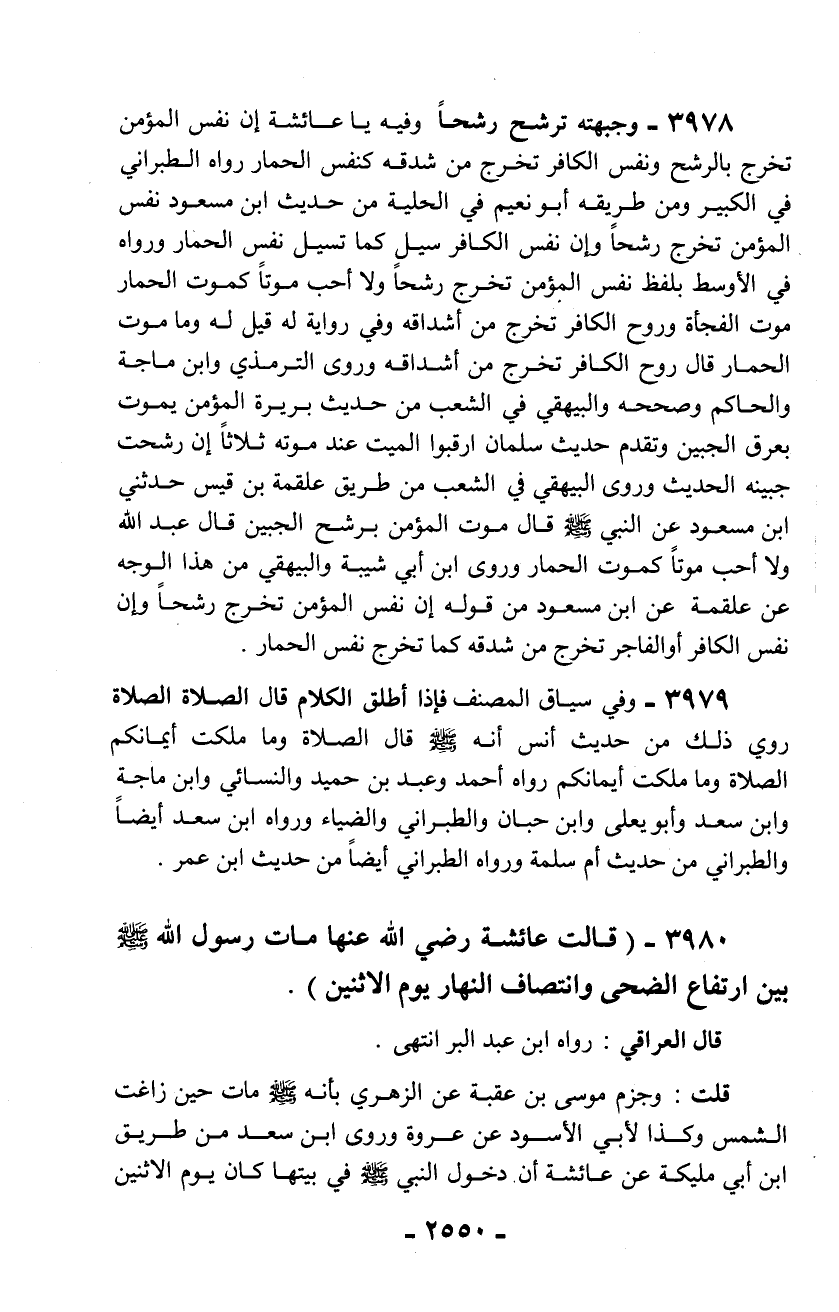 3978 - وجبهته ترشح رشحاً وفيه يا عائشة إن نفس المؤمن تخرج بالرشح ونفس الكافر تخرج من شدقه كنفس الحمار رواه الطبراني في الكبير ومن طريقه أبو نعيم في الحلية من حديث ابن مسعود نفس المؤمن تخرج رشحاً وإن نفس الكافر سيل كما تسيل نفس الحمار ورواه في الأوسط بلفظ نفس المؤمن تخرج رشحاً ولا أحب موتاً كموت الحمار موت الفجأة وروح الكافر تخرج من أشداقه وفي رواية له قيل له وما موت الحمار قال روح الكافر تخرج من أشداقه وروى الترمذي وابن ماجة والحاكم وصححه والبيهقي في الشعب من حديث بريرة المؤمن يموت بعرق الجبين وتقدم حديث سلمان ارقبوا الميت عند موته ثلاثاً إن رشحت جبينه الحديث وروى البيهقي في الشعب من طريق علقمة بن قيس حدثني ابن مسعود عن النبي - صلّى الله عليه وسلم - قال موت المؤمن برشح الجبين قال عبد الله ولا أحب موتاً كموت الحمار وروى ابن أبي شيبة والبيهقي من هذا الوجه عن علقمة عن ابن مسعود من قوله إن نفس المؤمن تخرج رشحاً وإن نفس الكافر أوالفاجر تخرج من شدقه كما تخرج نفس الحمار.