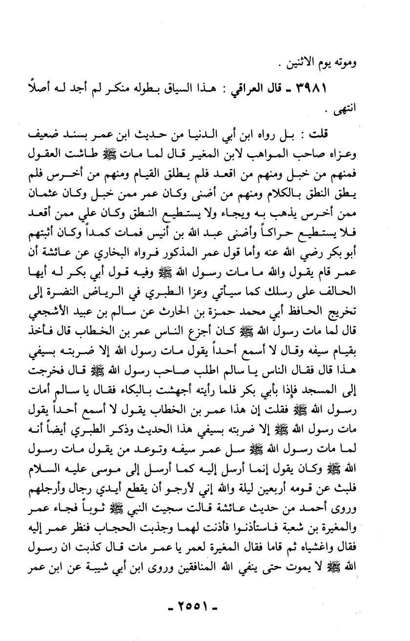 قلت: بل رواه ابن أبي الدنيا من حديث ابن عمر بسند ضعيف وعزاه صاحب المواهب لابن المغير قال لما مات - صلّى الله عليه وسلم - طاشت العقول فمنهم من خبل ومنهم من أقعد فلم يطلق القيام ومنهم من أخرس فلم يطق النطق بالكلام ومنهم من أضنى وكان عمر ممن خبل وكان عثمان ممن أخرس يذهب به ويجاء ولا يستطيع النطق وكان علي ممن أقعد فلا يستطيع حراكاً وأضنى عبد الله بن أنيس فمات كمداً وكان أثبتهم أبو بكر رضي الله عنه وأما قول عمر المذكور فرواه البخاري عن عائشة أن عمر قام يقول والله ما مات رسول الله - صلّى الله عليه وسلم - وفيه قول أبى بكر له أيها الحالف على رسلك كما سيأتي وعزا الطبري في الرياض النضرة إلى تخريج الحافظ أبي محمد حمزة بن الحارث عن سالم بن عبيد الأشجعي قال لما مات رسول الله - صلّى الله عليه وسلم - كان أجزع الناس عمر بن الخطاب قال فأخذ بقيام سيفه وقال لا أسمع أحداً يقول مات رسول الله إلا ضربته بسيفي هذا قال فقال الناس يا سالم اطلب صاحب رسول الله - صلّى الله عليه وسلم - قال فخرجت إلى المسجد فإذا بأبي بكر فلما رأيته أجهشت بالبكاء فقال يا سالم أمات رسول الله - صلّى الله عليه وسلم - فقلت إن هذا عمر بن الخطاب يقول لا أسمع أحدا يقول مات رسول الله - صلّى الله عليه وسلم - إلا ضربته بسيفي هذا الحديث وذكر الطبري أيضاً أنه لما مات رسول الله - صلّى الله عليه وسلم - سل عمر سيفه وتوعد من يقول مات رسول الله - صلّى الله عليه وسلم - وكان يقول إنما أرسل إليه كما أرسل إلى موسى عليه السلام فلبث عن قومه أربعين ليلة والله إني لأرجو أن يقطع أيدي رجال وأرجلهم وروى أحمد من حديث عائشة قالت سجيت النبي - صلّى الله عليه وسلم - ثوباً فجاء عمر والمغيرة بن شعبة فاستأذنوا فأذنت لهما وجذبت الحجاب فنظر عمر إليه فقال واغشياه ثم قاما فقال المغيرة لعمر يا عمر مات قال كذبت أن رسول الله - صلّى الله عليه وسلم - لا يموت حتى ينفي الله المنافقين وروى ابن أبي شيبة عن ابن عمر