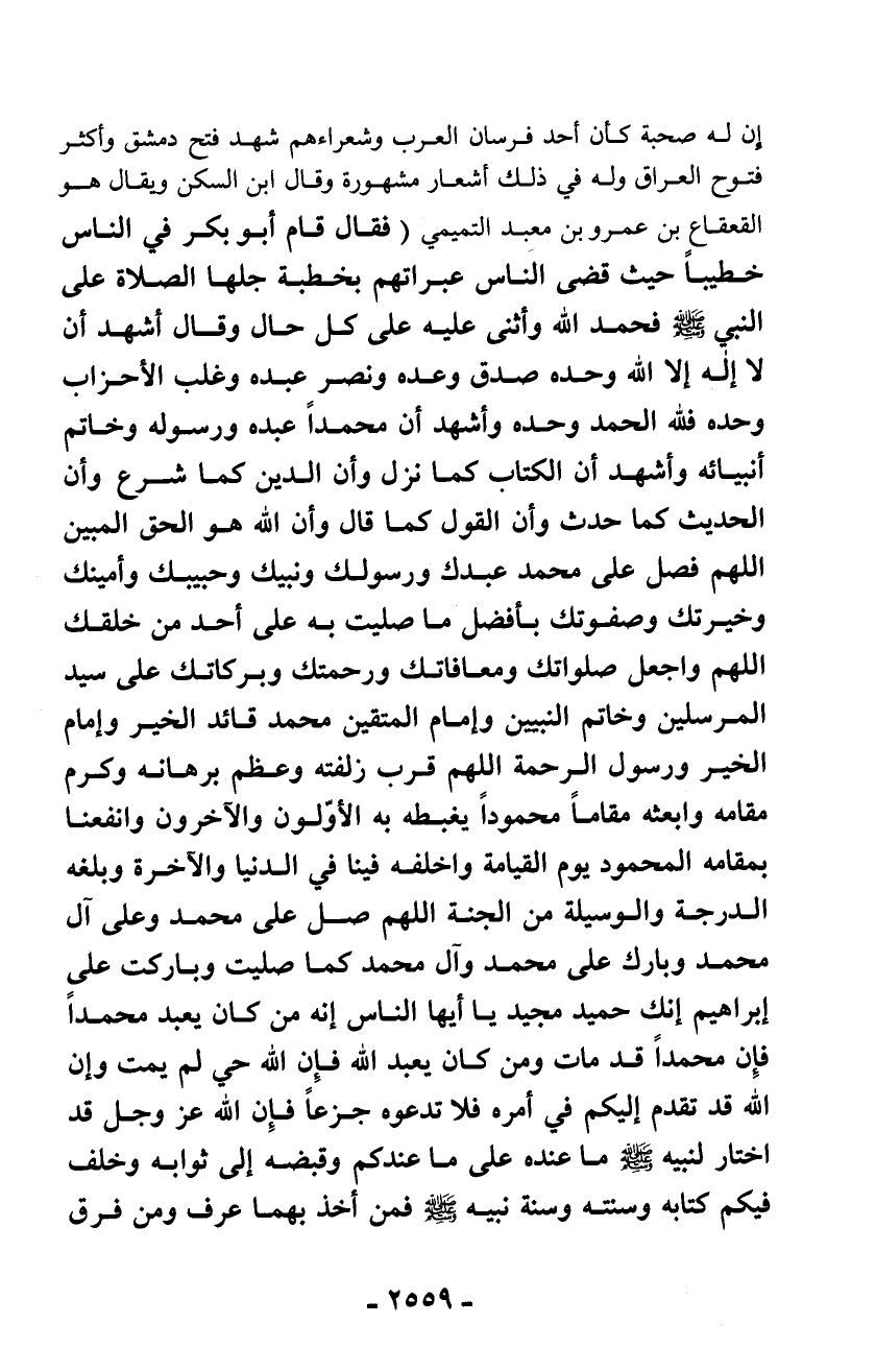 إن له صحبة كان أحد فرسان العرب وشعراءهم شهد فتح دمشق وأكثر فتوح العراق وله في ذلك أشعار مشهورة وقال ابن السكن ويقال هو القعقاع بن عمرو بن معبد التميمي (فقال قام أبو بكر في الناس خطيباً حيث قضى الناس عبراتهم بخطبة جلها الصلاة على النبي - صلّى الله عليه وسلم - فحمد الله وأثنى عليه على كل حال وقال أشهد أن لا إله إلا الله وحده صدق وعده ونصر عبده وغلب الأحزاب وحده فلله الحمد وحده وأشهد أن محمداً عبده ورسوله وخاتم أنبيائه وأشهد أن الكتاب كما نزل وأن الدين كما شرع وأن الحديث كما حدث وأن القول كما قال وأن الله هو الحق المبين اللهم فصل على محمد عبدك ورسولك ونبيك وحبيبك وأمينك وخيرتك وصفوتك بأفضل ما صليت به على أحد من خلقك اللهم واجعل صلواتك ومعافاتك ورحمتك وبركاتك على سيد المرسلين وخاتم النبيين وإمام المتقين محمد قائد الخير وإمام الخير ورسول الرحمة اللهم قرب زلفته وعظم برهانه وكرم مقامه وابعثه مقاماً محموداً يغبطه به الأوّلون والآخرون وانفعنا بمقامه المحمود يوم القيامة واخلفه فينا في الدنيا والآخرة وبلغه الدرجة والوسيلة من الجنة اللهم صل على محمد وعلى آل محمد وبارك على محمد وآل محمد كما صليت وباركت على إبراهيم إنك حميد مجيد يا أيها الناس إنه من كان يعبد محمداً فإن محمداً قد مات ومن كان يعبد الله فإن الله حي لم يمت وإن الله قد تقدم إليكم في أمره فلا تدعوه جزعاً فإن الله عز وجل قد اختار لنبيه - صلّى الله عليه وسلم - ما عنده على ما عندكم وقبضه إلى ثوابه وخلف فيكم كتابه وسنته ومشة نبيه - صلّى الله عليه وسلم - فمن أخذ بهما عرف ومن فرق