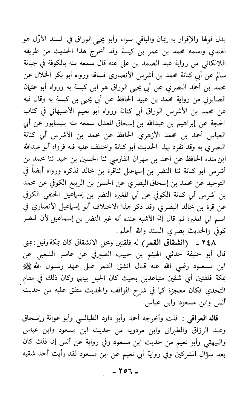 248 - (انشقاق القمر) له فلقتين ومحل الانشقاق كان بمكة وقيل: بمنى قال أبو حنيفة حدثني الهيثم بن حبيب الصيرفي عن عامر الشعبي عن ابن مسعود رضي الله عنه قال انشق القمر على عهد رسول الله - صلى الله عليه وسلم - بمكة فلقتين أي شقين متباعدين بحيث كان الجبل بينهما وكان ذلك في مقام التحدي فكان معجزة كما في شرح المواقف والحديث متفق عليه من حديث أنس وابن مسعود وابن عباس
