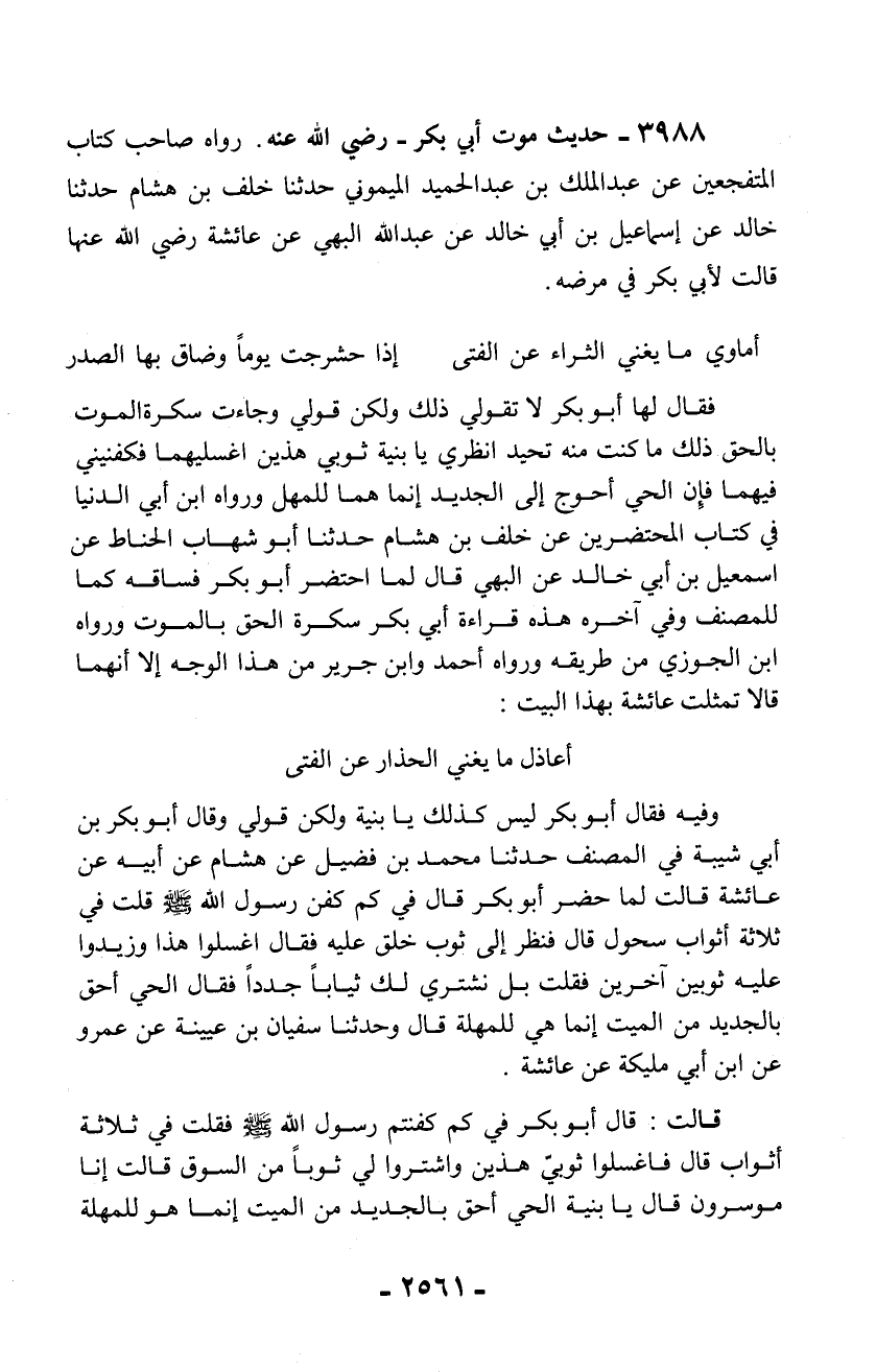 3988 - حديث موت أبي بكر -رضي الله عنه-. رواه صاحب كتاب المتفجعين عن عبد الملك بن عبد الحميد الميموني حدثنا خلف بن هشام حدثنا خالد عن إسماعيل بن أبي خالد عن عبد الله البهي عن عائشة رضي الله عنها قالت لأبي بكر في مرضه.
