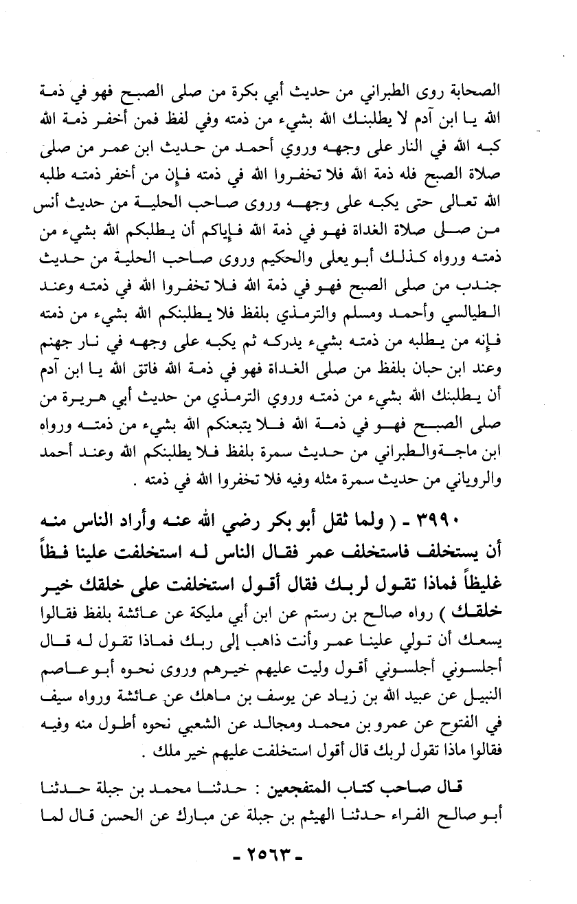 الصحابة روى الطبراني من حديث أبي بكرة من صلّى الصبح فهو في ذمة الله يا ابن آدم لا يطلبنك الله بشيء من ذمته وفي لفظ فمن أخفر ذمة الله كبه الله في النار على وجهه وروي أحمد من حديث ابن عمر من صلّى صلاة الصبح فله ذمة الله فلا تخفروا الله فى ذمته فإن من أخفر ذمته طلبه الله تعالى حتى يكبه على وجهه وروى صاحب الحلية من حديث أنس من صلّى صلاة الغداة فهو في ذمة الله فإياكم أن يطلبكم الله بشيء من ذمته ورواه كذلك أبو يعلى والحكيم وروى صاحب الحلية من حديث جندب من صلّى الصبح فهو في ذمة الله فلا تخفروا الله في ذمته وعند الطيالسي وأحمد ومسلم والترمذي بلفظ فلا يطلبنكم الله بشيء من ذمته فإنه من يطلبه من ذمته بشيء يدركه ثم يكبه على وجهه في نار جهنم وعند ابن حبان بلفظ من صلّى الغداة فهو في ذمة الله فاتق الله يا ابن آدم أن يطلبنك الله بشيء من ذمته وروي الترمذي من حديث أبي هريرة من صلّى الصبح فهو في ذمة الله فلا يتبعنكم الله بشيء من ذمته ورواه ابن ماجة والطبراني من حديث سمرة بلفظ فلا يطلبنكم الله وعند أحمد والروياني من حديث سمرة مثله وفيه فلا تخفروا الله في ذمته.