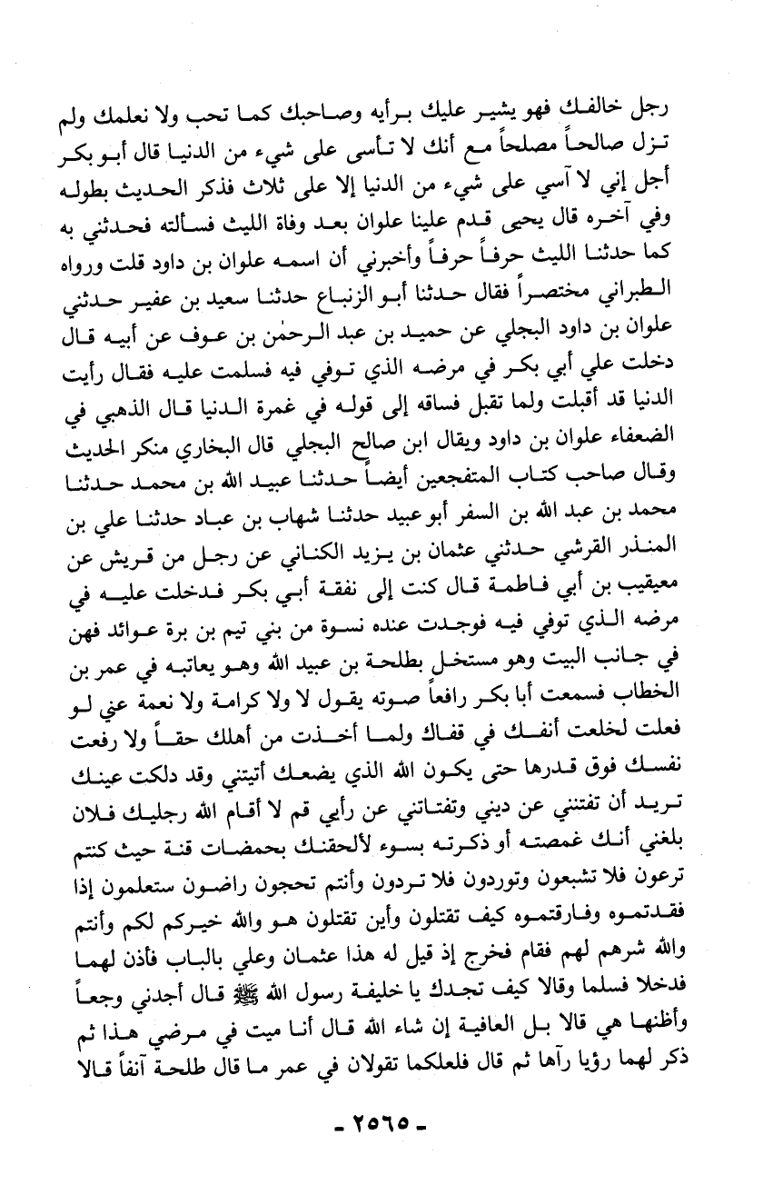 رجل خالفك فهو يشير عليك برأيه وصاحبك كما تحب ولا نعلمك ولم تزل صالحاً مصلحاً مع أنك لا تأسى على شيء من الدنيا قال أبو بكر أجل إني لا آسي على شيء من الدنيا إلا على ثلاث فذكر الحديث بطوله وفي آخره قال يحيى قدم علينا علوان بعد وفاة الليث فسألته فحدثني به كما حدثنا الليث حرفاً حرفاً وأخبرني أن اسمه علوان بن داود قلت ورواه الطبراني ختصراً فقال حدثنا أبو الزنباع حدثنا سعيد بن عفير حدثني علوان بن داود البجلي عن حميد بن عبد الرحمن بن عوف عن أبيه قال دخلت علي أبي بكر في مرضه الذي توفي فيه فسلمت عليه فقال رأيت الدنيا قد أقبلت ولما تقبل فساقه إلى قوله في غمرة الدنيا قال الذهبي في الضعفاء علوان بن داود ويقال ابن صالح البجلي قال البخاري منكر الحديث وقال صاحب كتاب المتفجعين أيضاً حدثنا عبيد الله بن محمد حدثنا محمد بن عبد الله بن السفر أبو عبيد حدثنا شهاب بن عباد حدثنا علي بن المنذر القرشي حدثني عثمان بن يزيد الكناني عن رجل من قريش عن معيقيب بن أبي فاطمة قال كنت إلى نفقة أبي بكر فدخلت عليه في مرضه الذي توفي فيه فوجدت عنده نسوة من بني تيم بن برة عوائد فهن في جانب البيت وهو مستخل بطلحة بن عبيد الله وهو يعاتبه في عمر بن الخطاب فسمعت أبا بكر رافعاً صوته يقول لا ولا كرامة ولا نعمة عني لو فعلت لخلعت أنفك في قفاك ولما أخذت من أهلك حقاً ولا رفعت نفسك فوق قدرها حتى يكون الله الذي يضعك أتيتني وقد دلكت عينك تريد أن تفتنني عن ديني وتفتاتني عن رأيي قم لا أقام الله رجليك فلان بلغني أنك غمصته أو ذكرته بسوء لألحقنك بحمضات قنة حيث كنتم ترعون فلا تشبعون وتوردون فلا تردون وأنتم تحجون راضون ستعلمون إذا فقدتموه وفارقتموه كيف تقتلون وأين تقتلون هو والله خيركم لكم وأنتم والله شرهم لهم فقام فخرج إذ قيل له هذا عثمان وعلي بالباب فأذن لهما فدخلا فسلما وقالا كيف تجدك يا خليفة رسول الله - صلّى الله عليه وسلم - قال أجدني وجعاً وأظنها هي قالا بل العافية إن شاء الله قال أنا ميت في مرضي هذا ثم ذكر لهما رؤيا رآها ثم قال فلعلكما تقولان في عمر ما قال طلحة آنفاً قالا