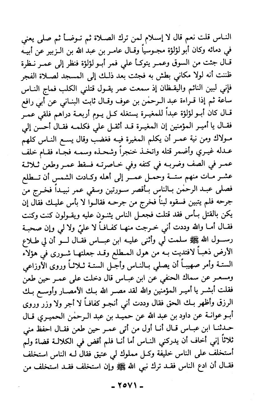 الناس قلت نعم قال لا إسلام لمن ترك الصلاة ثم توضأ ثم صلّى يعني في دمائه وكان أبو لؤلؤة مجوسياً وقال عامر بن عبد الله بن الزبير عن أبيه قال جئت من السوق وعمر يتوكأ علي فمر أبو لؤلؤة فنظر إلى عمر نظرة ظننت أنه لولا مكاني بطش به فجئت بعد ذلك إلى المسجد لصلاة الفجر فإني لبين النائم واليقظان إذ سمعت عمر يقول قتلني الكلب فماج الناس ساعة ثم إذا قراءة عبد الرحمن بن عوف وقال ثابت البناني عن أبي رافع قال كان أبو لؤلؤة عبداً للمغيرة يستغله كل يوم أربعة دراهم فلقي عمر فقال يا أمير المؤمنين إن المغيرة قد أثقل علي فكلمه فقال أحسن إلي مولاك ومن نية عمر أن يكلم المغيرة فيه فغضب وقال يسع الناس كلهم عدله غيري وأضمر قتله واتخذ خنجراً وشحذه وسمه فجاء فقام خلف عمر في الصف وضربه في كتفه وفي خاصرته فسقط عمر وطعن ثلاثة عشر مات منهم ستة وحمل عمر إلى أهله وكادت الشمس أن تطلع فصلى عبد الرحمن بالناس بأقصر سورتين وسقي عمر نبيداً فخرج من جرحه فلم يتبين فسقوه لبناً فخرج من جرحه فقالوا لا بأس عليك فقال إن يكن بالقتل بأس فقد قتلت فجعل الناس يثنون عليه ويقولون كنت وكنت فقال أما والله وددت أني خرجت منها كفافاً لا على ولا لي وإن صحبة رسول الله - صلّى الله عليه وسلم - سلمت لي وأثنى عليه ابن عباس فقال لو أن لي طلاع الأرض ذهباً لافتديت به من هول المطلع وقد جعلتها شورى في هؤلاء الستة وأمر صهيباً أن يصلي بالناس وأجل الستة ثلاثاً وروى الأوزاعي ومسعر عن سماك الحنفي عن ابن عباس قال دخلت على عمر حين طعن فقلت أبشر يا أمير المؤمنين والله لقد مصر الله بك الأمصار وأوسع بك الرزق وأظهر بك الحق فقال وددت أني أنجو كفافاً لا أجر ولا وزر وروى أبو عوانة عن داود بن عبد الله عن حميد بن عبد الرحمن الحميري قال حدثنا ابن عباس قال أنا أول من أتى عمر حين طعن فقال احفظ مني ثلاثاً إني أخاف أن يدركني الناس أما أنا فلم أقض في الكلالة قضاءً ولم أستخلف على الناس خليفة وكل مملوك لي عتيق فقال له الناس استخلف فقال أن ادع الناس فقد ترك نبي الله - صلّى الله عليه وسلم - وإن استخلف فقد استخلف من