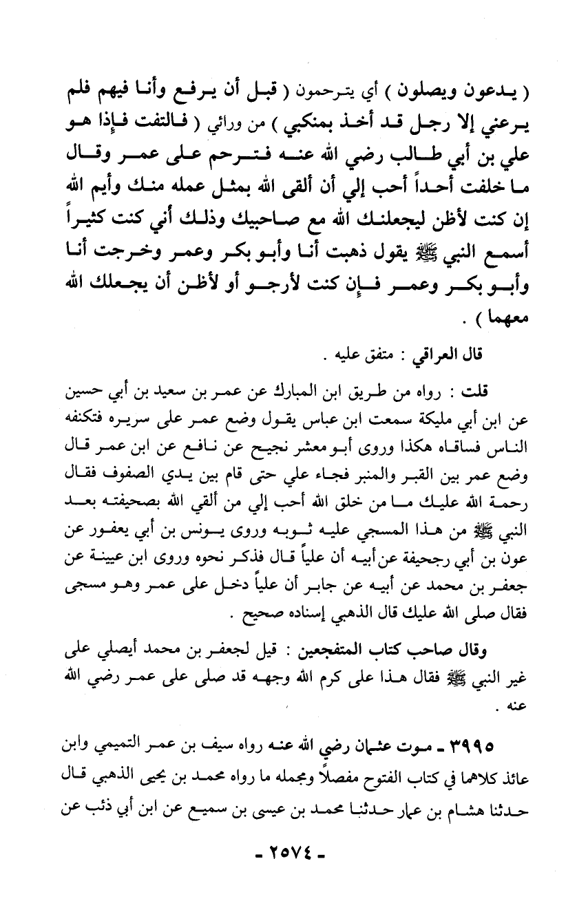 قلت: رواه من طريق ابن المبارك عن عمر بن سعيد بن أبي حسين عن ابن أبي مليكة سمعت ابن عباس يقول وضع عمر على سريره فتكنفه الناس فساقاه هكذا وروى أبو معشر نجيح عن نافع عن ابن عمر قال وضع عمر بين القبر والمنبر فجاء علي حتى قام بين يدي الصفوف فقال رحمة الله عليك مامن خلق الله أحب إلي من ألقي الله بصحيفته بعد النبي - صلّى الله عليه وسلم - من هذا المسجي عليه ثوبه وروى يونس بن أبي يعفور عن عون بن أبي رجحيفة عن أبيه أن علياً قال فذكر نحوه وروى ابن عيينة عن جعفر بن محمد عن أبيه عن جابر أن علياً دخل على عمر وهو مسجى فقال صلّى الله عليك قال الذهبي إسناده صحيح.