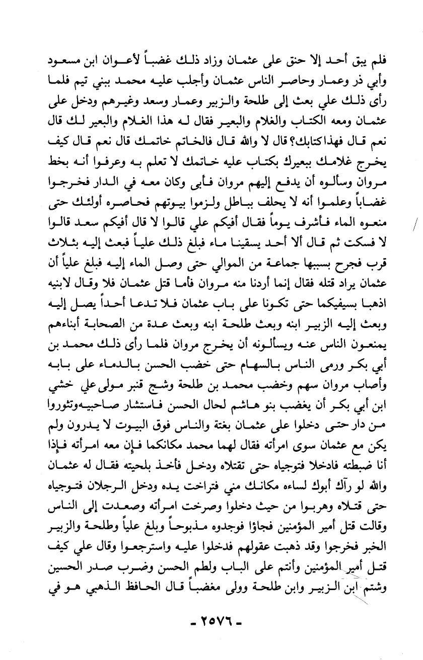 فلم يبق أحد إلا حنق على عثمان وزاد ذلك غضباً لأعوان ابن مسعود وأبي ذر وعمار وحاصر الناس عثمان وأجلب عليه محمد ببني تيم فلما رأى ذلك علي بعث إلى طلحة والزبير وعمار وسعد وغيرهم ودخل على عثمان ومعه الكتاب والغلام والبعير فقال له هذا الغلام والبعير لك قال نعم قال فهذا كتابك؟ قال لا والله قال فالخاتم خاتمك قال نعم قال كيف يخرج غلامك ببعيرك بكتاب عليه خاتمك لا تعلم به وعرفوا أنه بخط مروان وسألوه أن يدفع إليهم مروان فأبى وكان معه في الدار فخرجوا غضاباً وعلموا أنه لا يحلف بباطل ولزموا بيوتهم فحاصره أولئك حتى منعوه الماء فأشرف يوماً فقال أفيكم علي قالوا لا قال أفيكم سعد قالوا لا فسكت ثم قال ألا أحد يسقينا ماء فبلغ ذلك علياً فبعث إليه بثلاث قرب فجرح بسببها جماعة من الموالي حتى وصل الماء إليه فبلغ علياً أن عثمان يراد قتله فقال إنما أردنا منه مروان فأما قتل عثمان فلا وقال لابنيه اذهبا بسيفيكما حتى تكونا على باب عثمان فلا تدعا أحداً يصل إليه وبعث إليه الزبير ابنه وبعث طلحة ابنه وبعث عدة من الصحابة أبناءهم يمنعون الناس عنه ويسألونه أن يخرج مروان فلما رأى ذلك محمد بن أبي بكر ورمى الناس بالسهام حتى خضب الحسن بالدماء على بابه وأصاب مروان سهم وخضب محمد بن طلحة وشج قنبر مولى علي خشي ابن أبي بكر أن يغضب بنو هاشم لحال الحسن فاستشار صاحبيه وتثوروا من دار حتى دخلوا على عثمان بغتة والناس فوق البيوت لا يدرون ولم يكن مع عثمان سوى امرأته فقال لهما محمد مكانكما فإن معه امرأته فإذا أنا ضبطته فادخلا فتوجياه حتى تقتلاه ودخل فأخذ بلحيته فقال له عثمان والله لو رآك أبوك لساءه مكانك مني فتراخت يده ودخل الرجلان فتوجياه حتى قتلاه وهربوا من حيث دخلوا وصرخت امرأته وصعدت إلى الناس وقالت قتل أمير المؤمنين فجاؤا فوجدوه مذبوحاً وبلغ علياً وطلحة والزبير الخبر فخرجوا وقد ذهبت عقولهم فدخلوا عليه واسترجعوا وقال علي كيف قتل أمير المؤمنين وأنتم على الباب ولطم الحسن وضرب صدر الحسين وشتم ابن الزبير وابن طلحة وولى مغضباً قال الحافظ الذهبي هو في