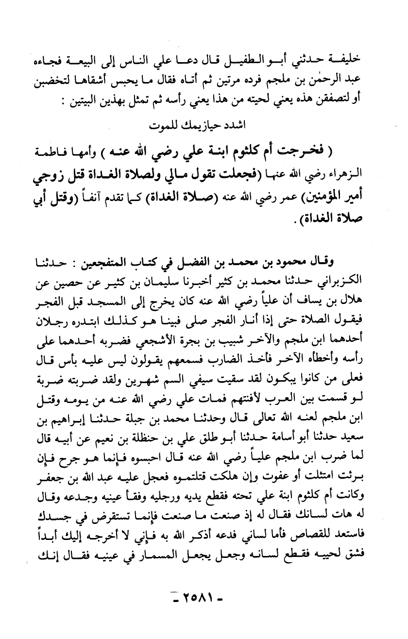 خليفة حدثني أبو الطفيل قال دعا علي الناس إلى البيعة فجاءه عبد الرحمن بن ملجم فرده مرتين ثم أتاه فقال ما يحبس أشقاها لتخضبن أو لتصفقن هذه يعني لحيته من هذا يعني رأسه ثم تمثل بهذين البيتين: