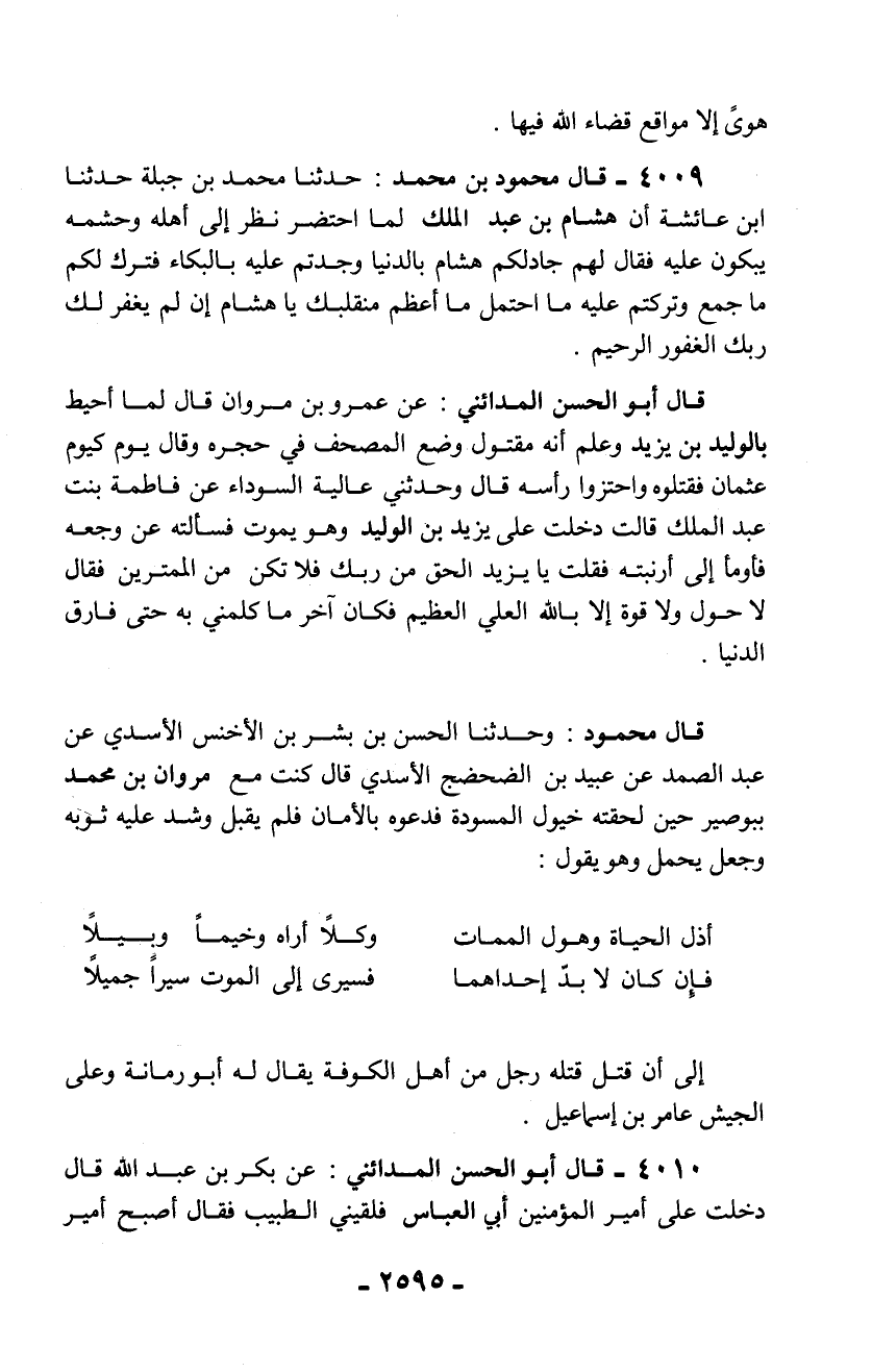 4009 - قال محمود بن محمد: حدثنا محمد بن جبلة حدثنا ابن عائشة أن هشام بن عبد الملك لما احتضر نظر إلى أهله وحشمه يبكون عليه فقال لهم جادلكم هشام بالدنيا وجدتم عليه بالبكاء فترك لكم ما جمع وتركتم عليه ما احتمل ما أعظم منقلبك يا هشام إن لم يغفر لك ربك الغفور الرحيم.