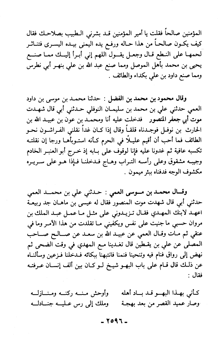 المؤمنين صالحاً فقلت يا أمير المؤمنين قد بشرني الطبيب بصلاحك فقال كيف يكون صالحاً من هذا حاله ورفع يده اليمنى بيده اليسرى فتناثر لحمها على النطع قال وجعل يقول اللهم إني أبرأ إليك مما صنع يحيى بن محمد بأهل الموصل ومما صنع عبد الله بن علي بنهر أبي نطرس ومما صنع داود بن علي بكداء والطائف.