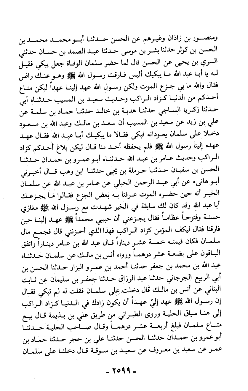 ومنصور بن زاذان وغيرهم عن الحسن حدثنا أبو محمد محمد بن الحسن بن كوثر حدثنا بشر بن موسى حدثنا عبد الصمد بن حسان حدثني السري بن يحيى عن الحسن قال لما حضر سلمان الوفاة جعل يبكي فقيل له يا أبا عبد الله ما يبكيك أليس فارقت رسول الله - صلّى الله عليه وسلم - وهو عنك راض فقال والله ما بي جزع الموت ولكن رسول الله عهد إلينا عهداً ليكن متاع أحدكم من الدنيا كزاد الراكب وحديث سعيد بن المسيب حدثناه أبي حدثنا زكريا الساجي حدثنا هدبة بن خالد حدثنا حماد بن سلمة عن علي بن زيد عن سعيد بن المسيب أن سعد بن مالك وعبد الله بن مسعود دخلا على سلمان يعودانه فبكى فقالا ما يبكيك أبا عبد الله فقال عهد عهده إلينا رسول الله - صلّى الله عليه وسلم - فلم يحفظه أحد منا قال ليكن بلاغ أحدكم كزاد الراكب وحديث عامر بن عبد الله حدثناه أبو عمرو بن حمدان حدثنا الحسن بن سفيان حدثنا حرملة بن يحيى حدثنا ابن وهب قال أخبرني أبو هانئ عن أبي عبد الرحمن الحبلي عن عامر بن عبد الله عن سلمان الخير أنه حين حضره الموت عرفنا به بعض الجزع فقالوا ما يجزعك أبا عبد الله وقد كان لك سابقة في الخير شهدت مع رسول الله - صلّى الله عليه وسلم - مغازي حسنة وفتوحاً عظاماً فقال يجزعني أن حبيبي محمداً - صلّى الله عليه وسلم - عهد إلينا حين فارقنا فقال ليكف المؤمن كزاد الراكب فهذا الذي أحزنني قال فجمع مال سلمان فكان قيمته خمسة عشر ديناراً قال عبد الله بن عامر ديناراً واتفق الباقون على بضعة عشر درهماً ورواه أنس بن مالك عن سلمان حدثناه عبد الله بن محمد بن جعفر حدثنا أحمد بن عمرو البزار حدثنا الحسن بن أبي الربيع الجرجاني حدثنا عبد الرزاق حدثنا جعفر بن سليمان عن ثابت البناني عن أنس بن مالك قال دخلت على سلمان فقلت له لم تبكي فقال إن رسول الله - صلّى الله عليه وسلم - عهد إليّ عهداً أن يكون زادك في الدنيا كزاد الراكب إلى هنا سياق الحلية وروى الطبراني من طريق علي بن بذيمة قال بيع متاع سلمان فبلغ أربعة عشر درهماً وقال صاحب الحلية حدثنا أبو عمرو بن حمدان حدثنا الحسن حدثنا علي بن حجر حدثنا حماد بن عمر عن سعيد بن معروف عن سعيد بن سوقة قال دخلنا على سلمان