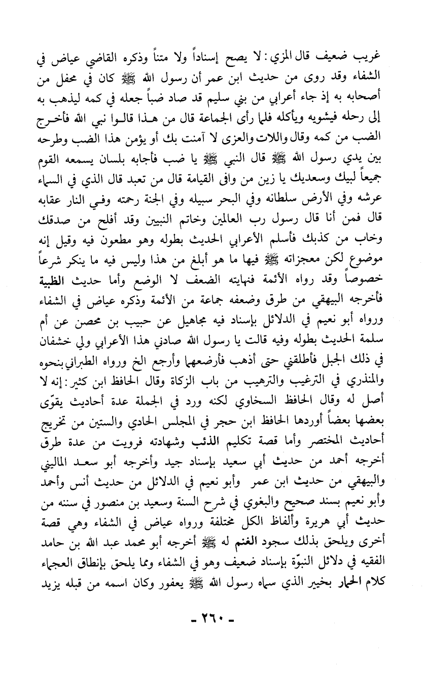 غريب ضعيف قال المزي: لا يصح إسناداً ولا متناً وذكره القاضي عياض في الشفاء وقد روى من حديث ابن عمر أن رسول الله - صلى الله عليه وسلم - كان في محفل من أصحابه به إذ جاء أعرابي من بني سليم قد صاد ضباً جعله في كمه ليذهب به إلى رحله فيشويه ويأكله فلما رأى الجماعة قال من هذا قالوا نبي الله فأخرج الضب من كمه وقال واللات والعزى لا آمنت بك أو يؤمن هذا الضب وطرحه بين يدي رسول الله - صلى الله عليه وسلم - قال النبي - صلى الله عليه وسلم - يا ضب فأجابه بلسان يسمعه القوم جميعاً لبيك وسعديك يا زين من وافى القيامة قال من تعبد قال الذي في السماء عرشه وفي الأرض سلطانه وفي البحر سبيله وفي الجنة رحمته وفي النار عقابه قال فمن أنا قال رسول رب العالمين وخاتم النبيين وقد أفلح من صدقك وخاب من كذبك فأسلم الأعرابي الحديث بطوله وهو مطعون فيه وقيل إنه موضوع لكن معجزاته - صلى الله عليه وسلم - فيها ما هو أبلغ من هذا وليس فيه ما ينكر شرعاً خصوصاً وقد رواه الأئمة فنهايته الضعف لا الوضع وأما حديث الظبية فأخرجه البيهقي من طرق وضعفه جماعة من الأئمة وذكره عياض في الشفاء ورواه أبو نعيم في الدلائل بإسناد فيه مجاهيل عن حبيب بن محصن عن أم سلمة الحديث بطوله وفيه قالت يا رسول الله صادني هذا الأعرابي ولي خشفان في ذلك الجبل فأطلقني حتى أذهب فأرضعهما وأرجع الخ ورواه الطبراني بنحوه والمنذري في الترغيب والترهيب من باب الزكاة وقال الحافظ ابن كثير: إنه لا أصل له وقال الحافظ السخاوي لكنه ورد في الجملة عدة أحاديث يقوى بعضها بعضاً أوردها الحافظ ابن حجر في المجلس الحادي والستين من تخريج أحاديث المختصر وأما قصة تكليم الذئب وشهادته فرويت من عدة طرق أخرجه أحمد من حديث أبي سعيد بإسناد جيد وأخرجه أبو سعد الماليني والبيهقي من حديث ابن عمر وأبو نعيم في الدلائل من حديث أنس وأحمد وأبو نعيم بسند صحيح والبغوي في شرح السنة وسعيد بن منصور في سننه من حديث أبي هريرة وألفاظ الكل مختلفة ورواه عياض في الشفاء وهي قصة أخرى ويلحق بذلك سجود الغنم له - صلى الله عليه وسلم - أخرجه أبو محمد عبد الله بن حامد الفقيه في دلائل النبوّة بإسناد ضعيف وهو في الشفاء ومما يلحق بإنطاق العجماء كلام الحمار بخيير الذي سماه رسول الله - صلى الله عليه وسلم - يعفور وكان اسمه من قبله يزيد