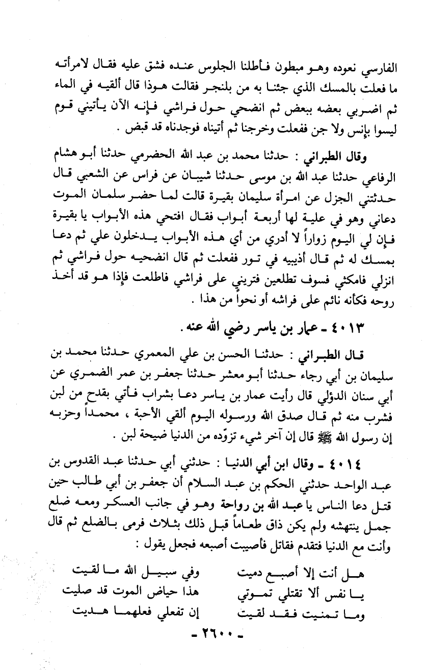 4014 - وقال ابن أبي الدنيا: حدثني أبي حدثنا عبد القدوس بن عبد الواحد حدثني الحكم بن عبد السلام أن جعفر بن أبي طالب حين قتل دعا الناس يا عبد الله بن رواحة وهو في جانب العسكر ومعه ضلع جمل ينتهشه ولم يكن ذاق طعاماً قبل ذلك بثلاث فرمى بالضلع ثم قال وأنت مع الدنيا فتقدم فقاتل فأصيبت أصبعه فجعل يقول: