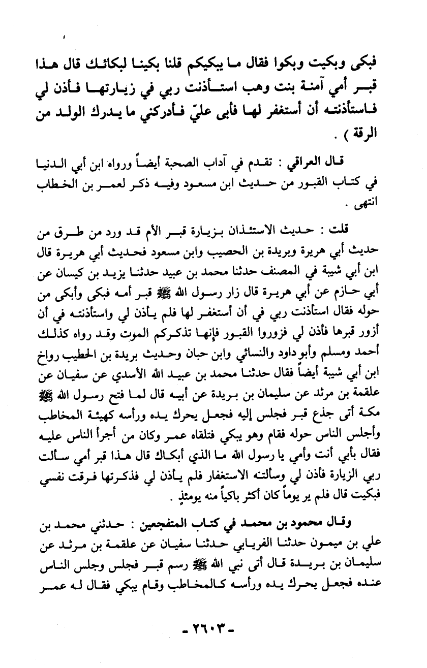 وقال محمود بن محمد في كتاب المتفجعين: حدثني محمد بن علي بن ميمون حدثنا الفريابي حدثنا سفيان عن علقمة بن مرثد عن سليمان بن بريدة قال أتى نبي الله - صلّى الله عليه وسلم - رسم قبر فجلس وجلس الناس عنده فجعل يحرك يده ورأسه كالمخاطب وقام يبكي فقال له عمر