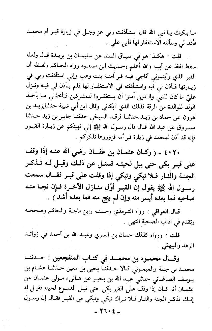 4020 - (وكان عثمان بن عفان رضي الله عنه إذا وقف على قبر بكى حتى يبل لحيته فسئل عن ذلك وقيل له تذكر الجنة والنار فلا تبكي وتبكي إذا وقفت على قبر فقال سمعت رسول الله - صلّى الله عليه وسلم - يقول إن القبر أوّل منازل الآخرة فإن نجا منه صاحبه فما بعده أيسر منه وإن لم ينج منه فما بعده أشد).